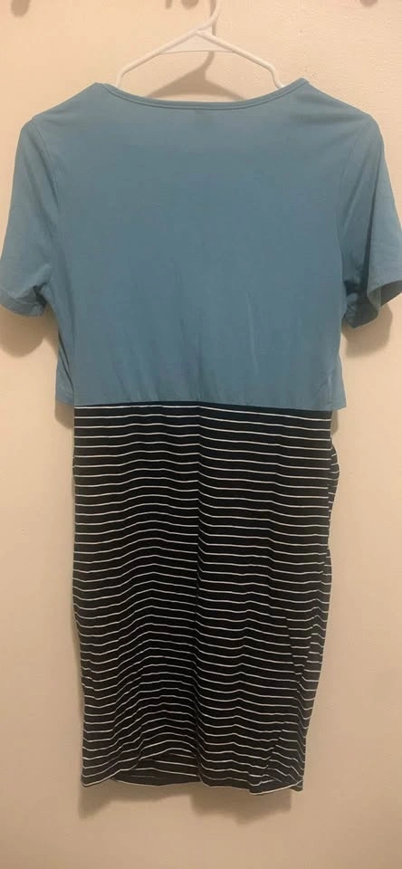 Shein Maternity & Nursing Blue & Striped Dress. It has a convenient teal top and black and white striped bottom! It's a size Medium and in great condition.