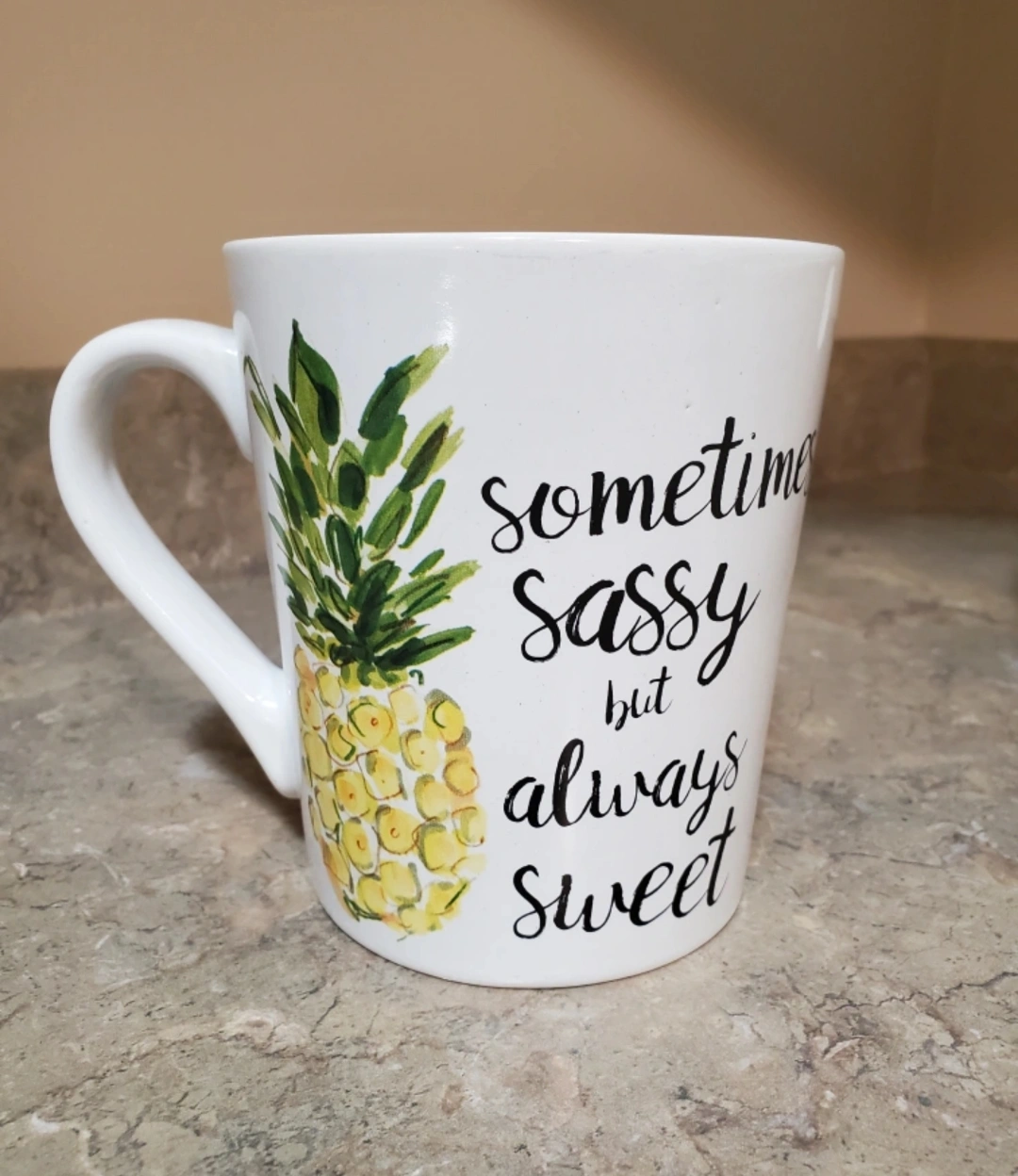 157Cute generous size mug. 20 oz. capacity. "Sometimes sassy but always sweet". Microwave and dishwasher safe. Minor wear on the inside from stirring. Good condition other than that. No cracks or chips. Pickup Oxford area.