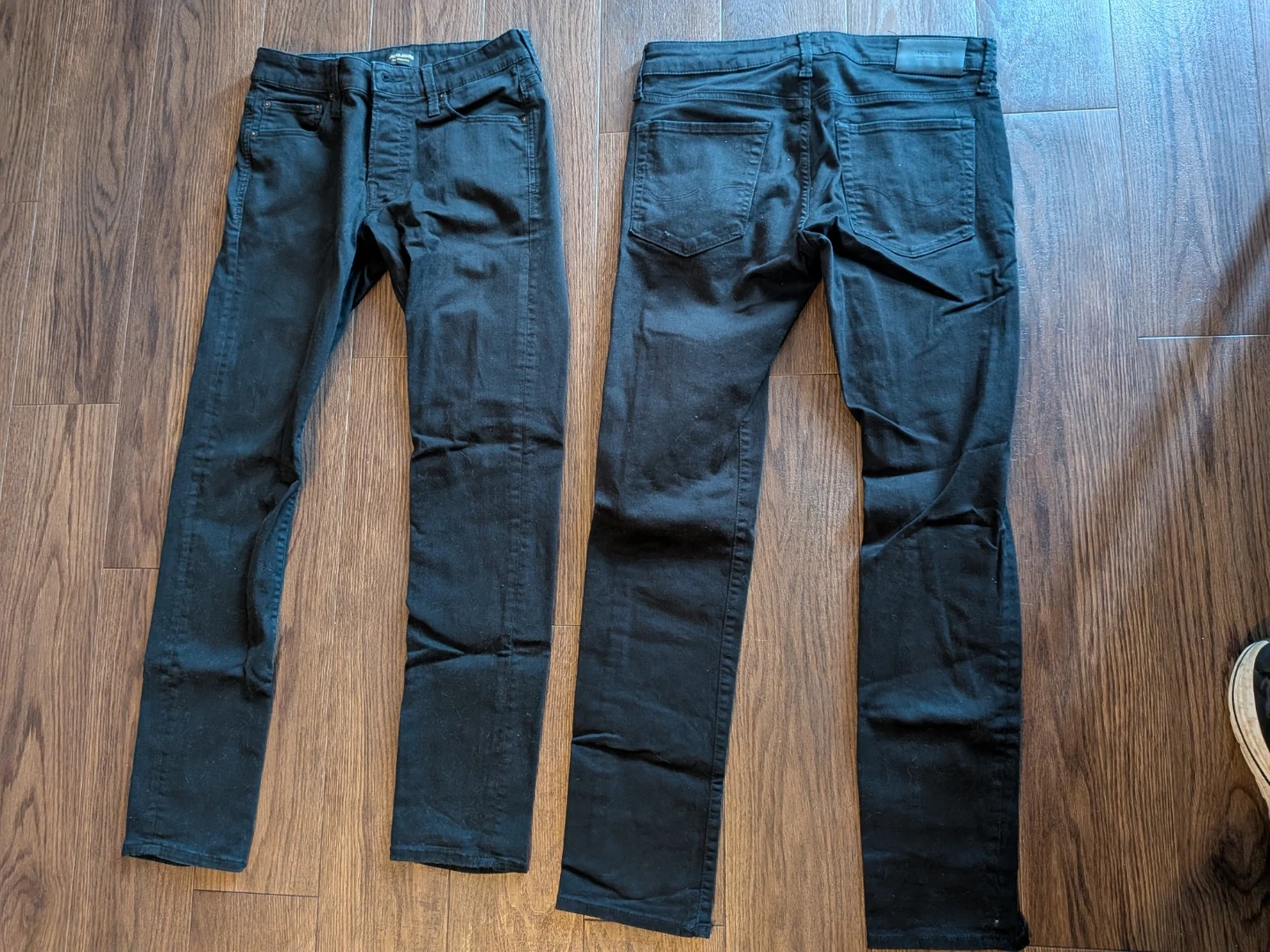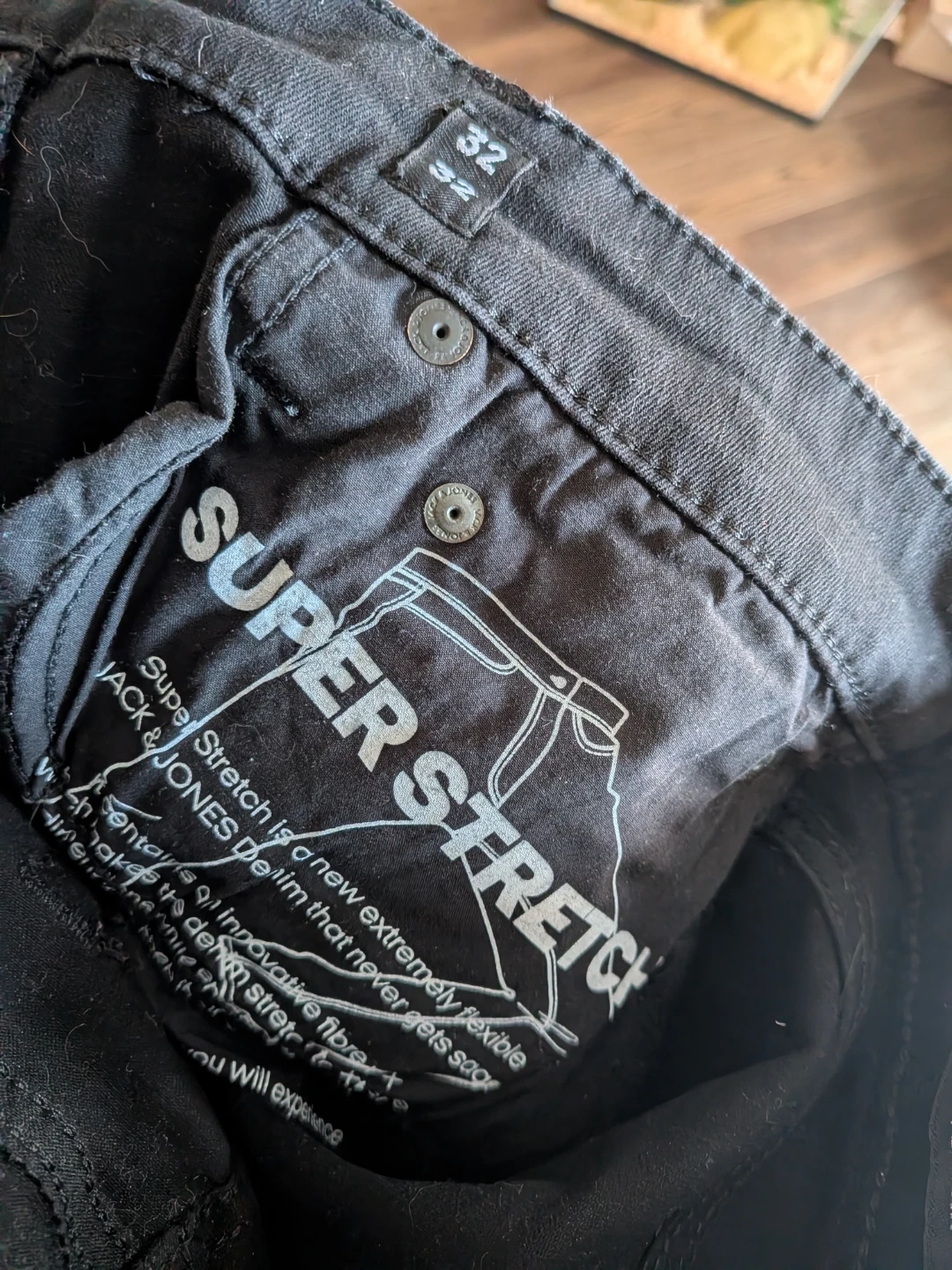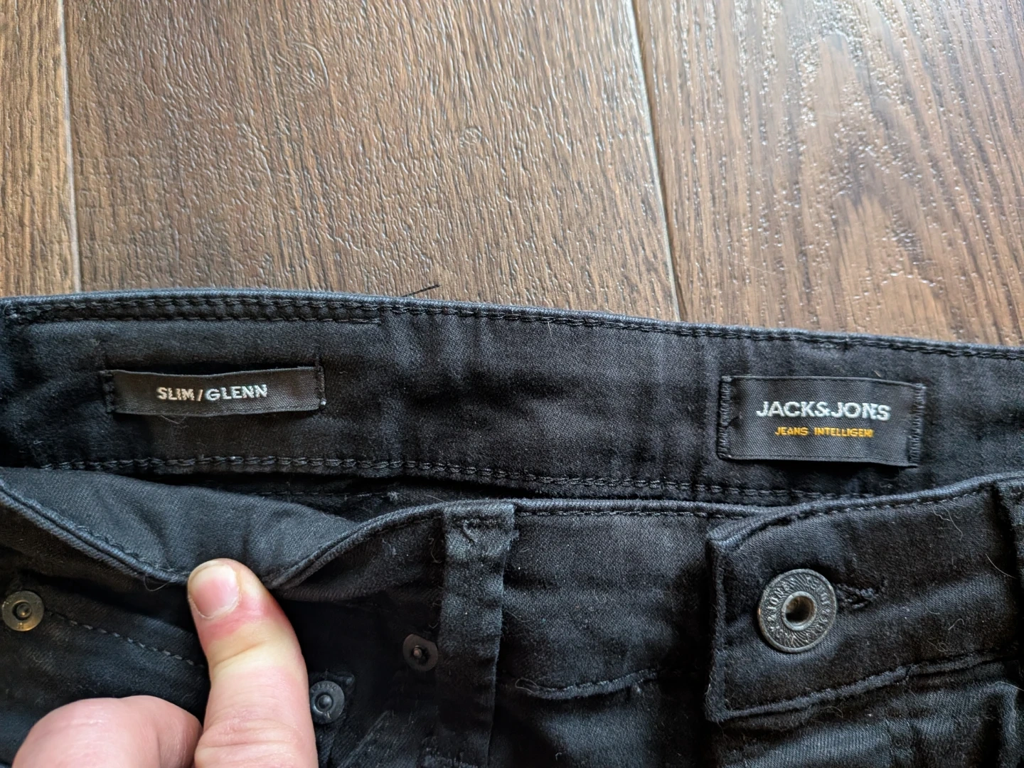 These are black Jack & Jones Slim/Glenn jeans. They're made with super stretch denim for comfort. Waist size is 32.