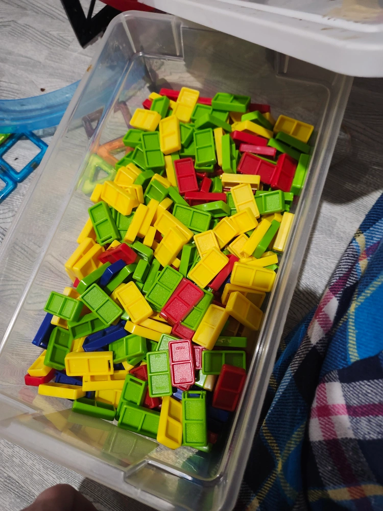25Large container of colourful dominoes. Great for family game nights. Many pieces included.