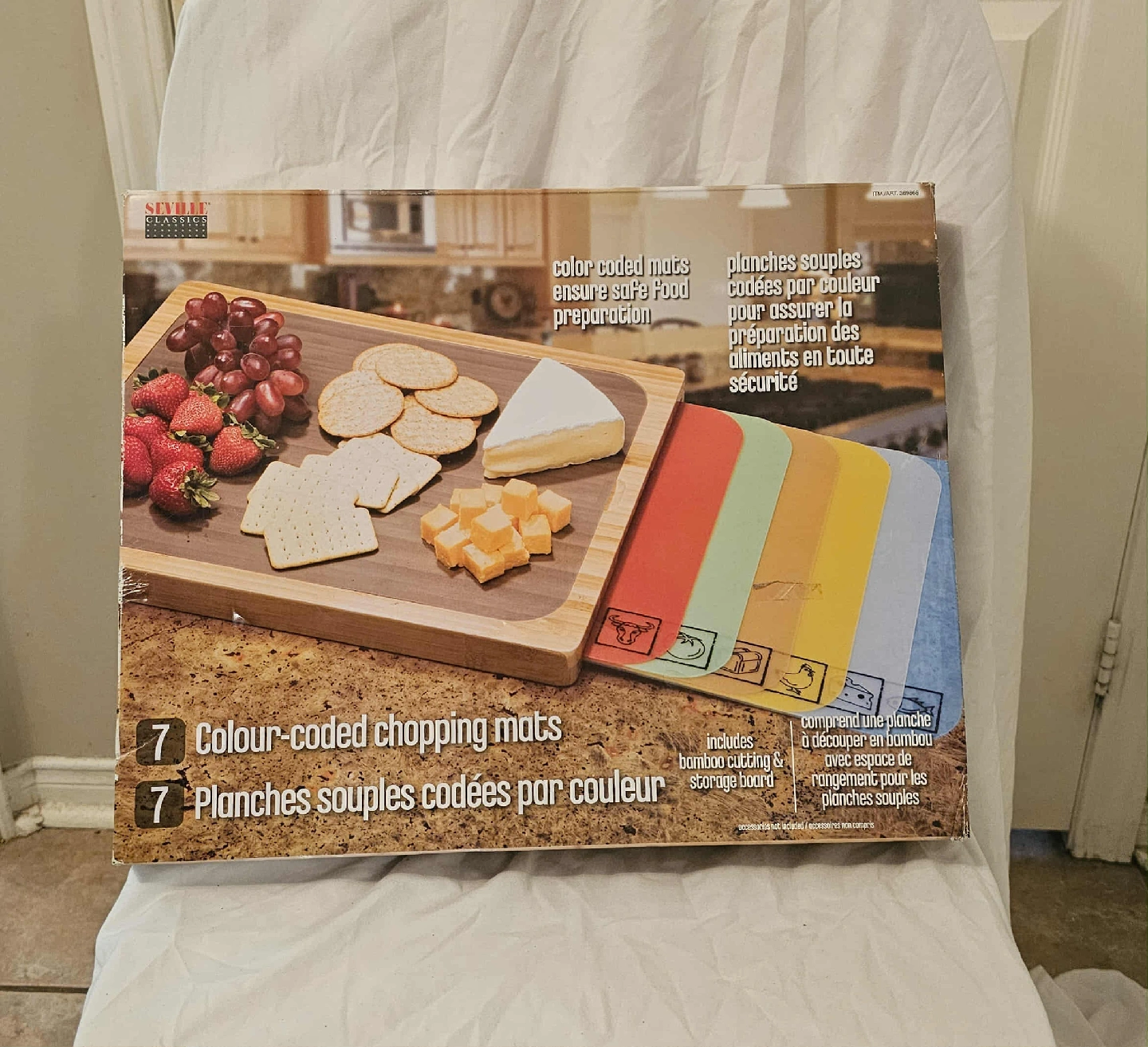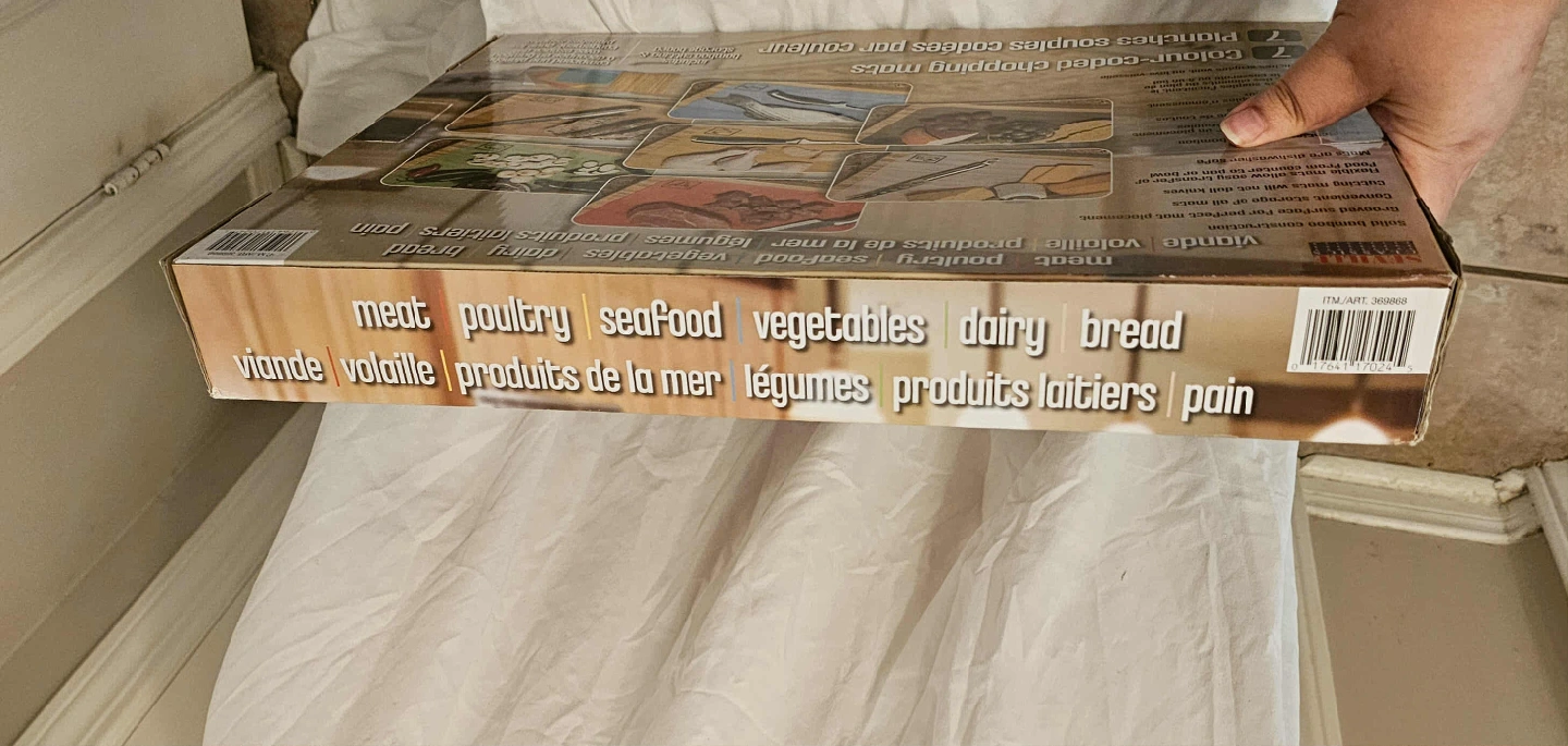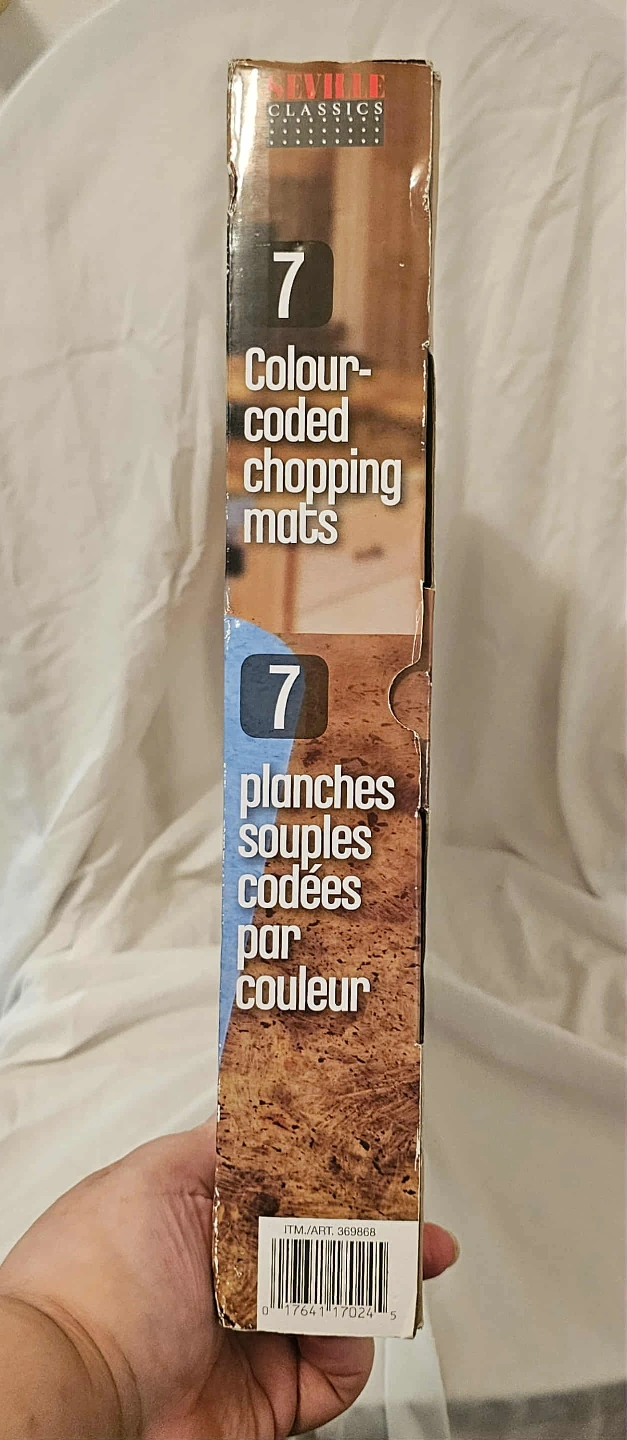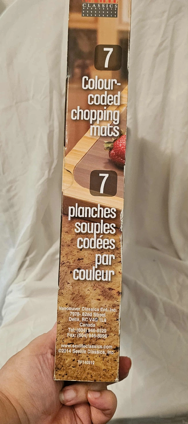 These Multi-Coloured Seville Classics 7 Colour-Coded Chopping Mats have some damage on the box but otherwise it is Brand New and never used. The Cutting and Storage Board is made of Bamboo. From a smoke free home. Cash and E-Transfer accepted. Pick up only.