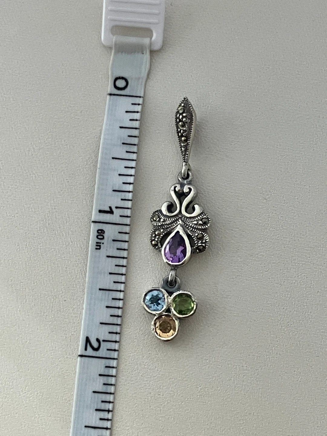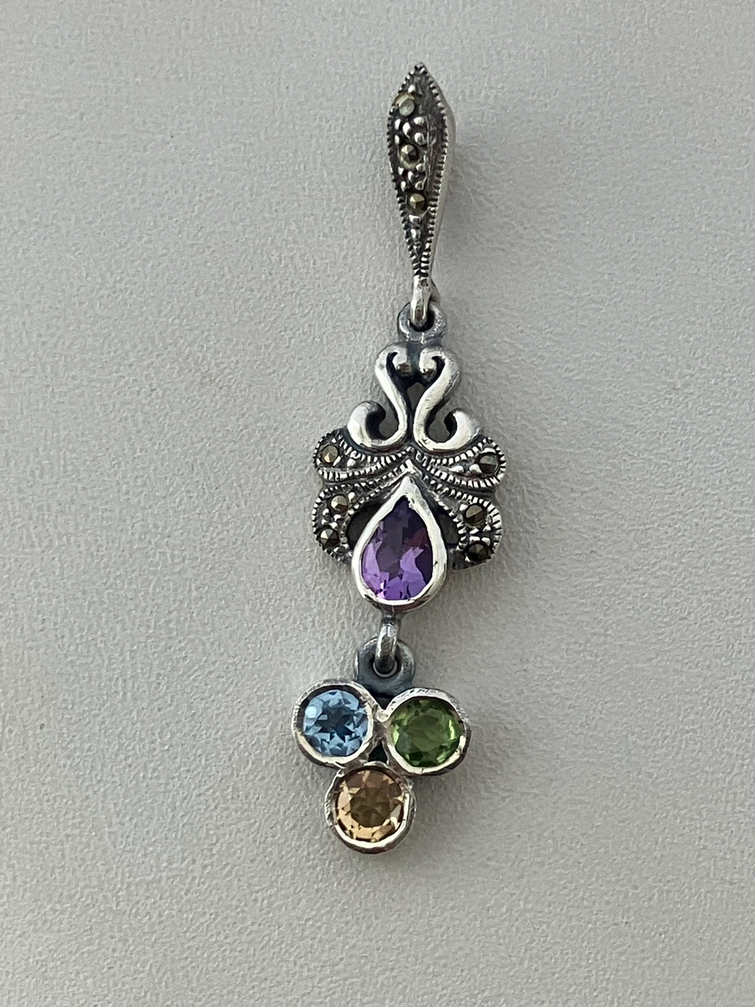 18Amethyst, Citrine, Blue topaz, Peridot & Marcasite. Here's a lovely sterling silver dangle earring featuring multiple gemstones in different colours. It's in great condition and comes in a box. Perfect for adding a touch of elegance to any outfit!