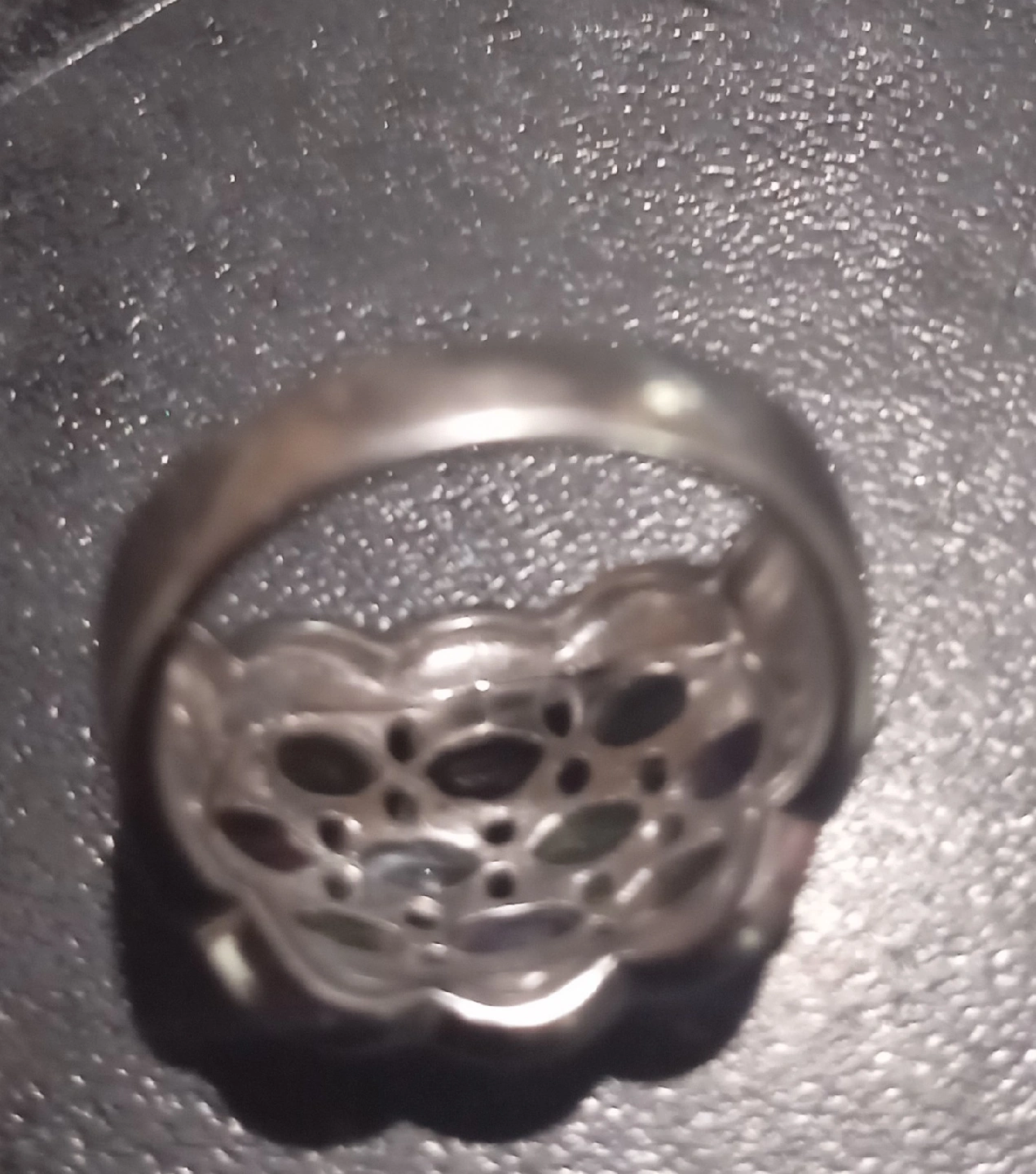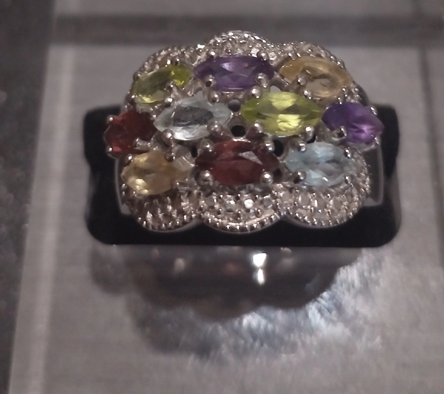 18Silver ring with multi-colcoured gem stones, 925 stamp, size 8, used like new, $40, pick up only, please see my other listings.