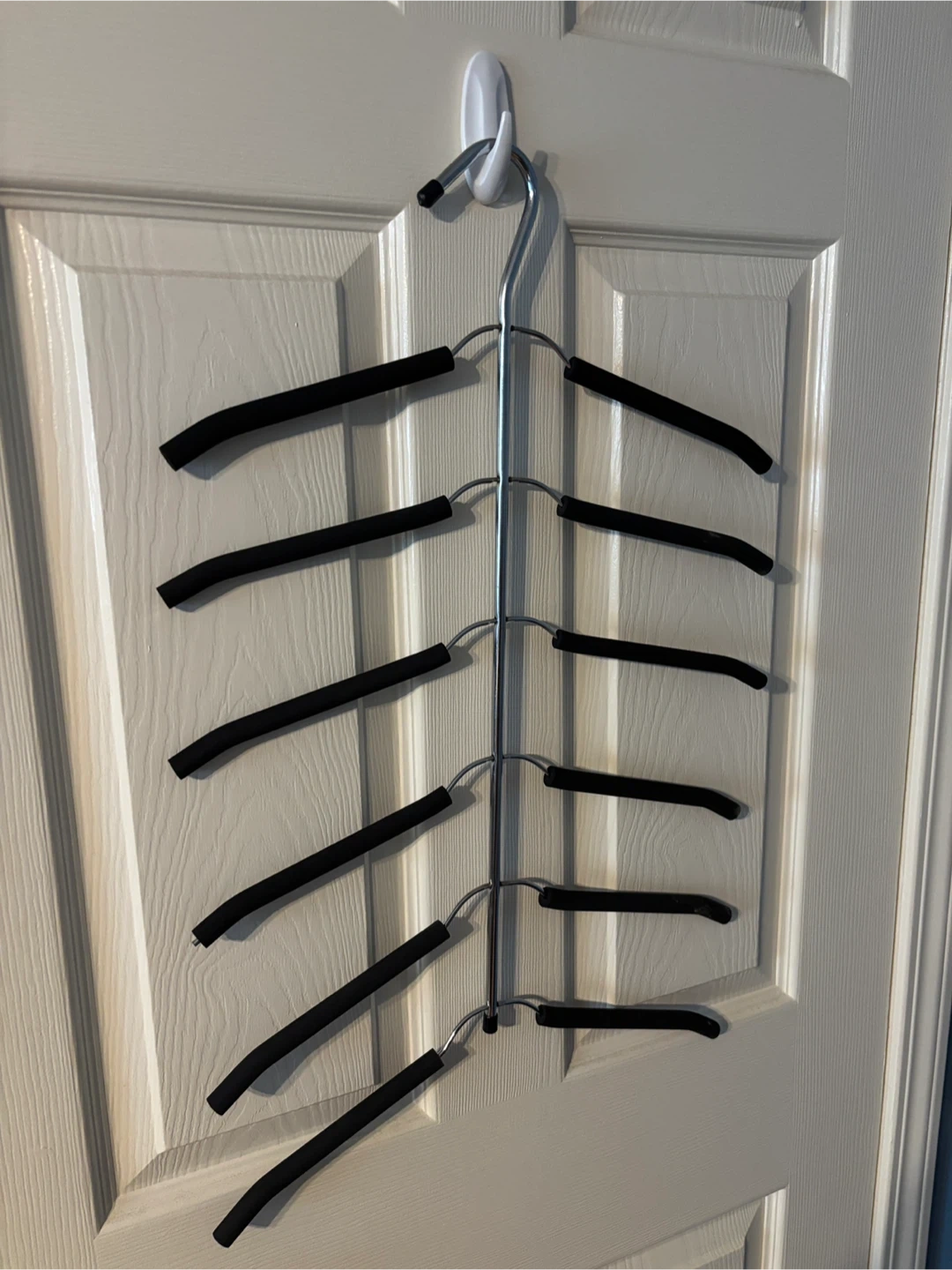 97Keep your scarves/dresses neatly organized with this handy multi hanger! It holds multiple scarves and saves closet space. Made of metal, covered in foam.