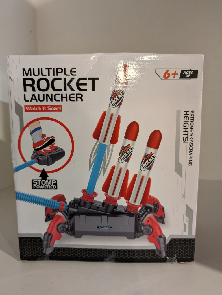 5Stomp-powered rocket launcher. Launches multiple rockets simultaneously. Extreme sky-scraping heights. Ages 6+