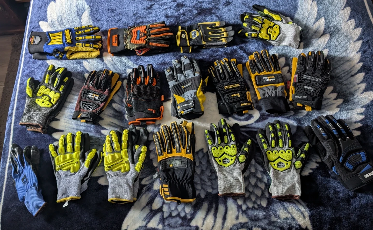A collection of assorted impact work gloves, featuring brands like Dakota, Terra, and others. These gloves offer varying levels of protection and grip for different tasks. They're suitable for construction, mechanics, or general labour. $25/pr