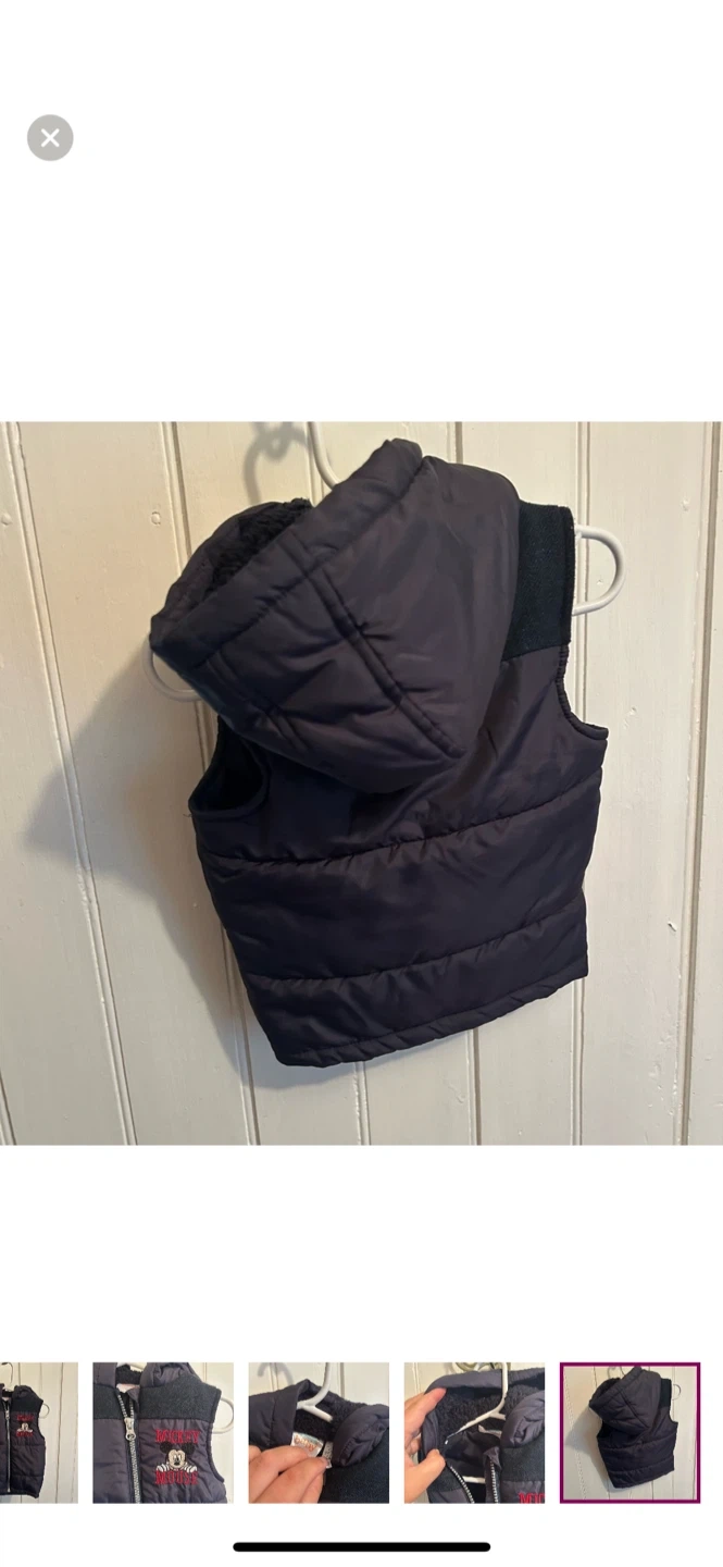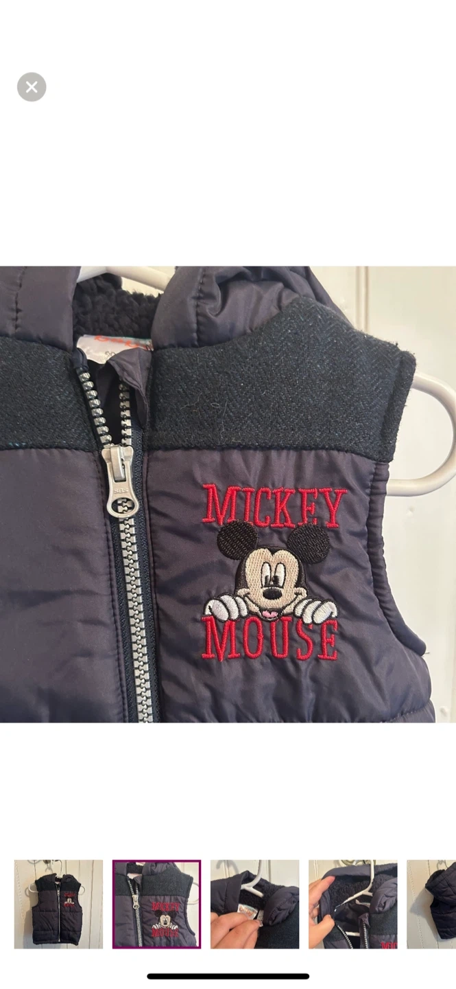 Disney brand. Zip up puffer vest. Navy blue with embroidered Mickey graphic. Size 12/18m. Brand new condition