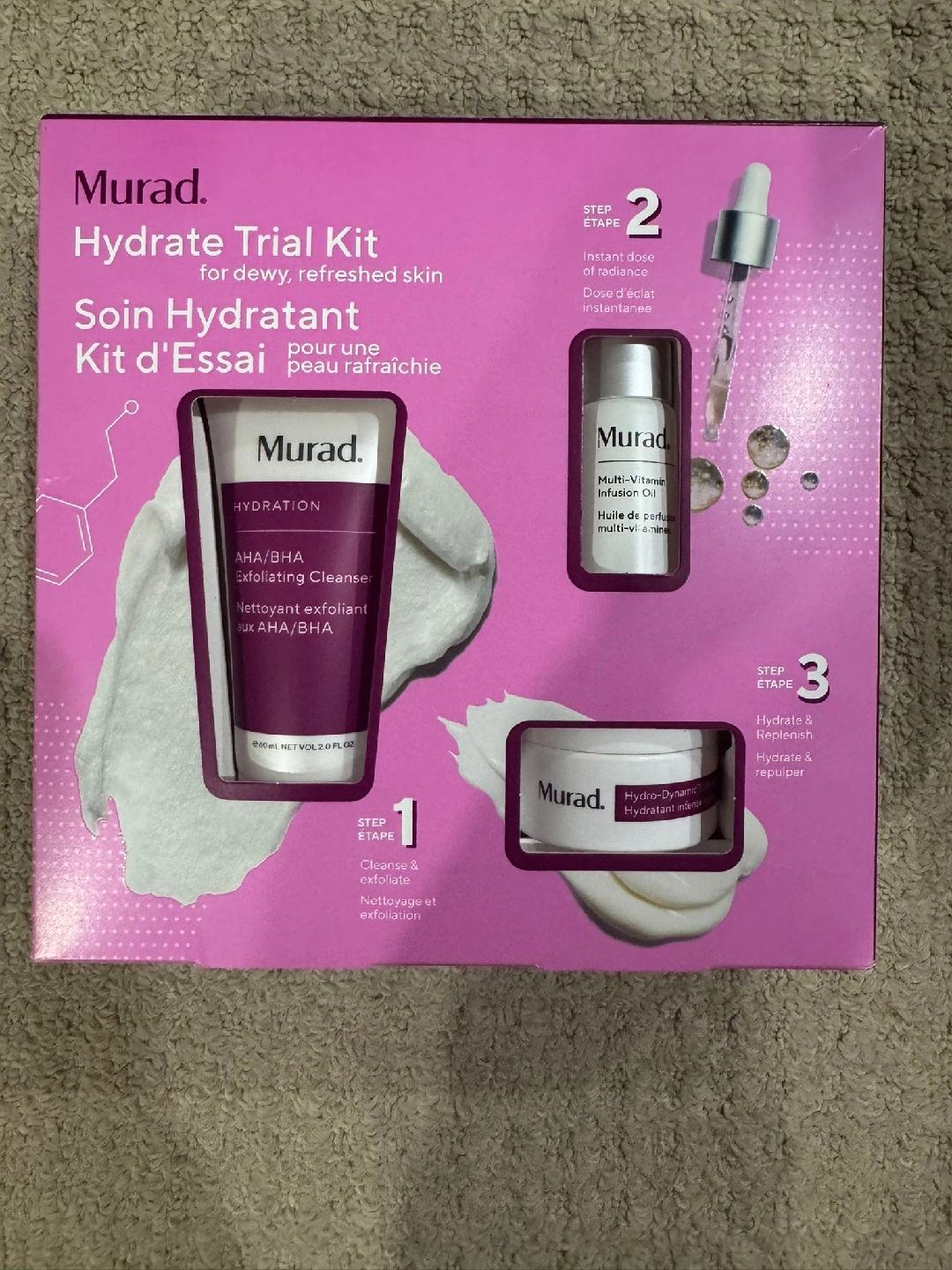 Selling a Murad Hydrate Trial Kit for dewy, refreshed skin! This kit includes an AHA/BHA exfoliating cleanser, multi-vitamin infusion oil, and hydro-dynamic hydratant intens