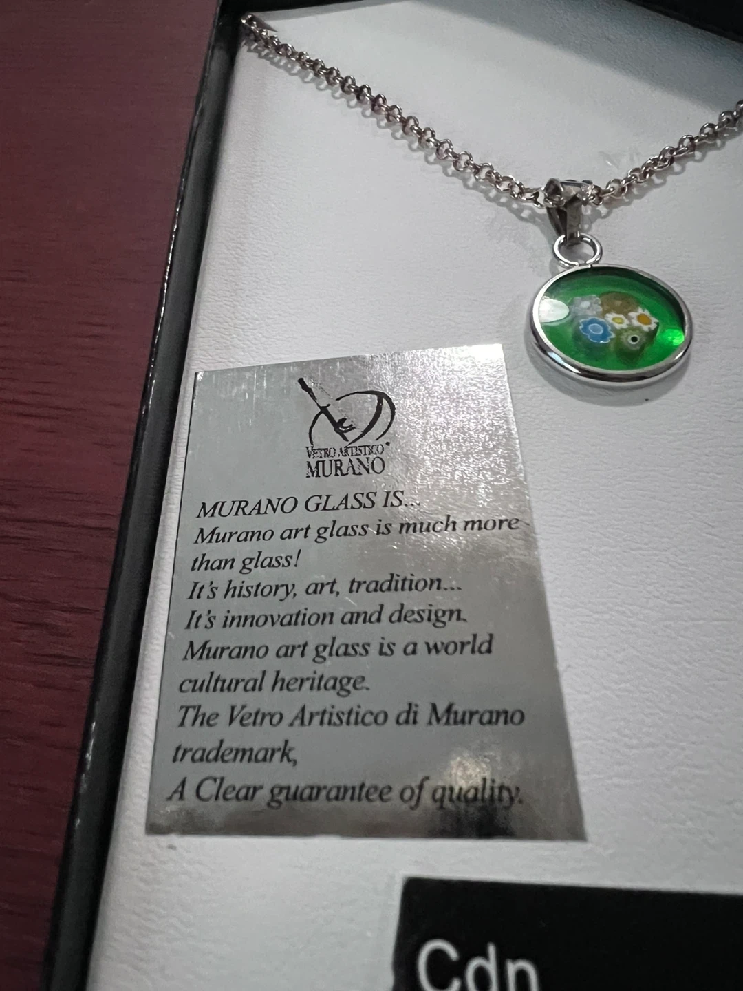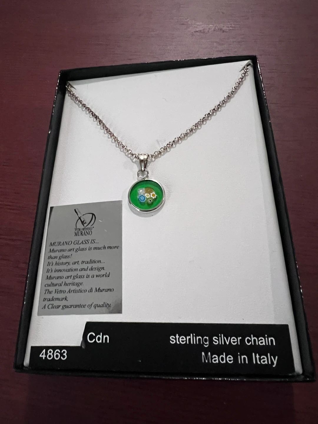 This Murano glass necklace features a sterling silver chain and was made in Italy. It comes in its original box, ensuring its protection. The pendant showcases the artistry of Murano glass, known for its innovation and design. A clear guarantee of quality! Cash only