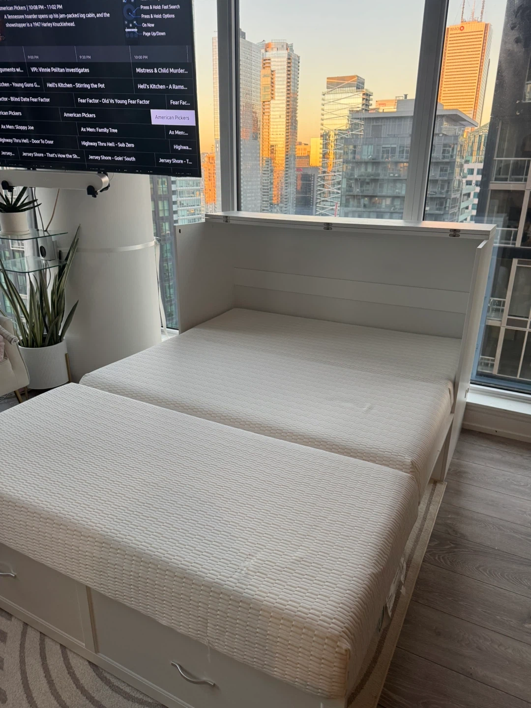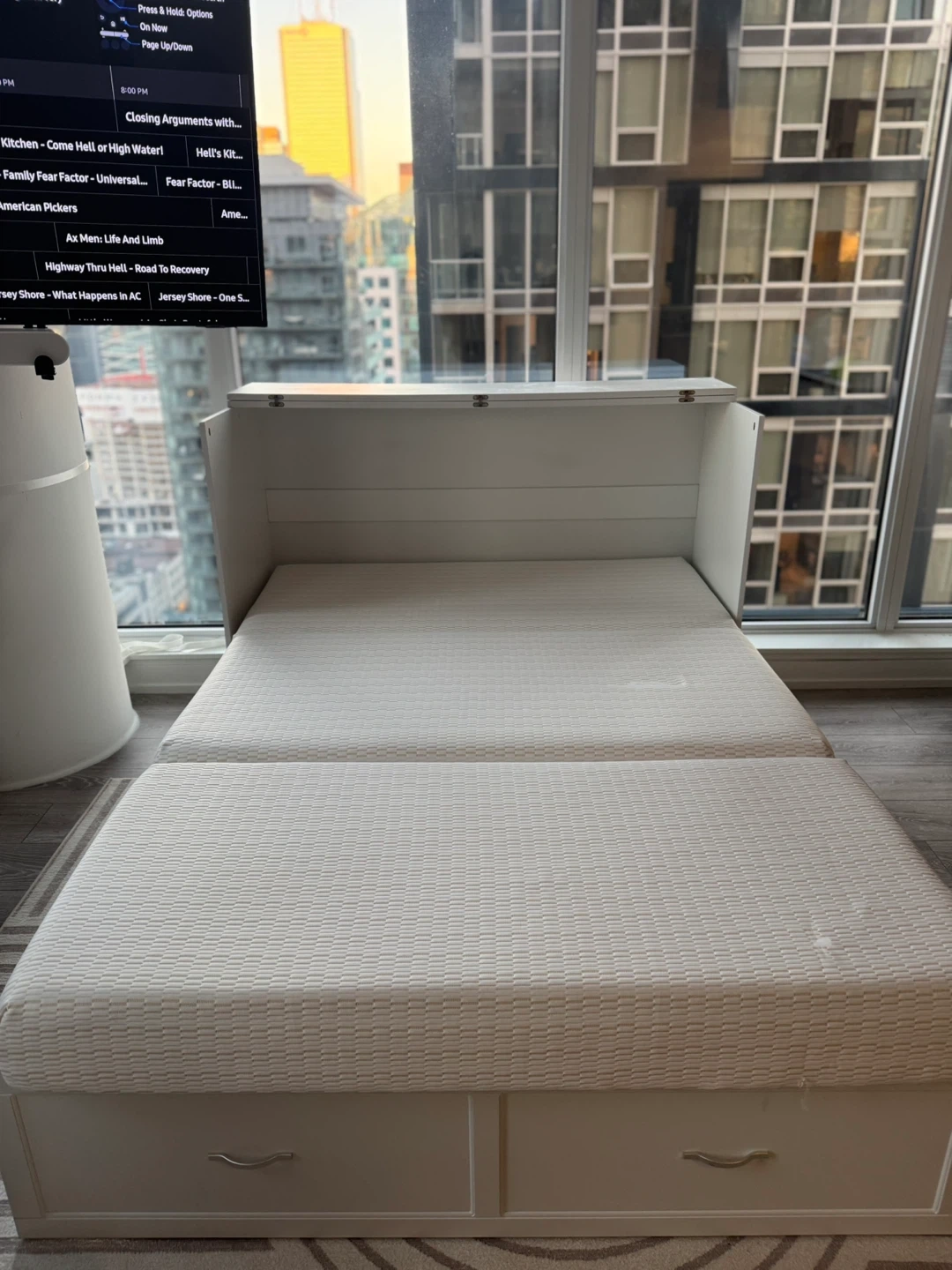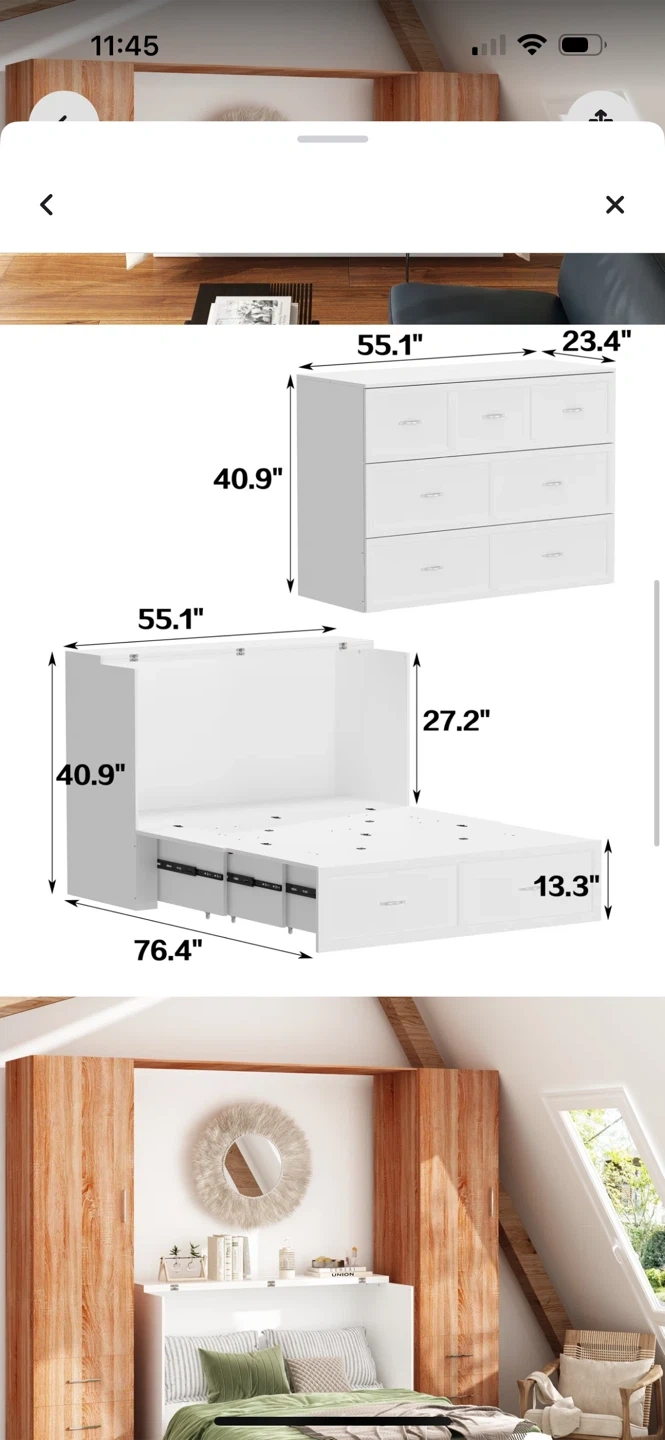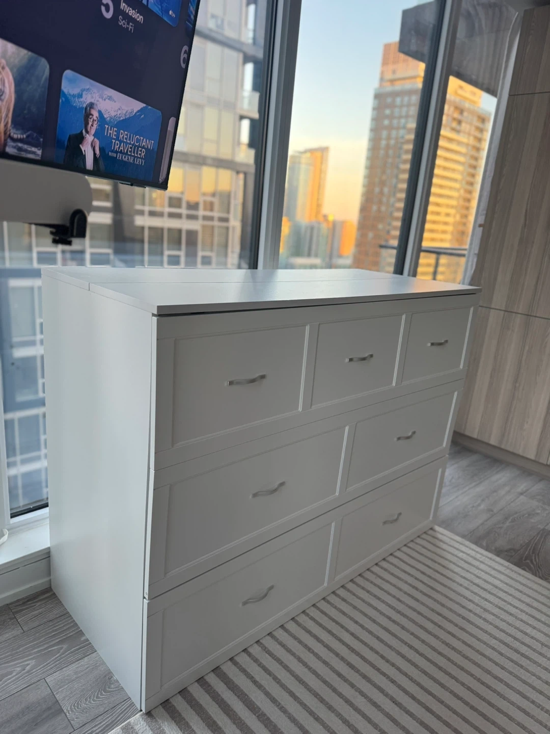 Looking to save space? This Murphy bed with dresser is a great solution! It features a white dresser that easily converts into a bed. The dimensions of the dresser are approximately 55.1" x 23.4" x 40.9". When converted into a bed, the dimensions are approximately 55.1" x 76.4" x 40.9". Full Size Bed when converted. I only use it for 6 months so it’s in great condition + no visible scratches. Price includes the Murphy Bed + the foldable mattress. *Help shipping with extra $100* Pick up Only **If you do pick up, please let me know beforehand so I can book the elevator**