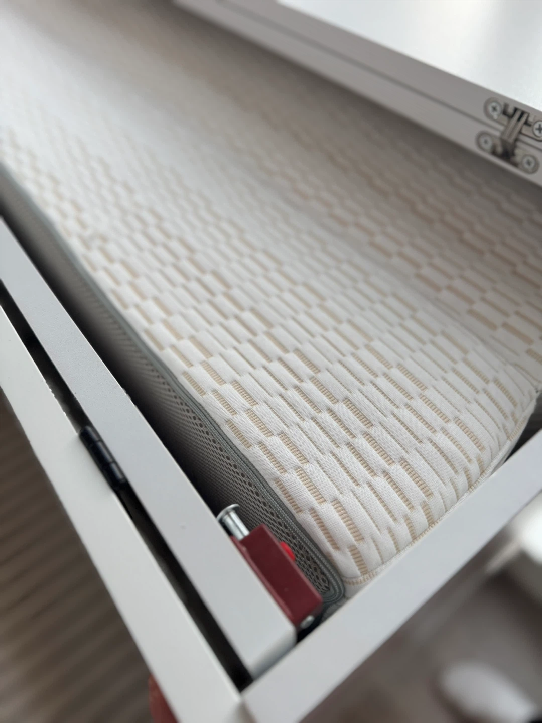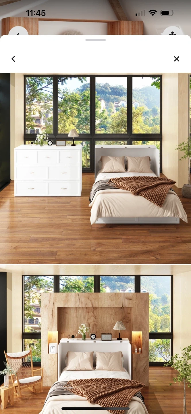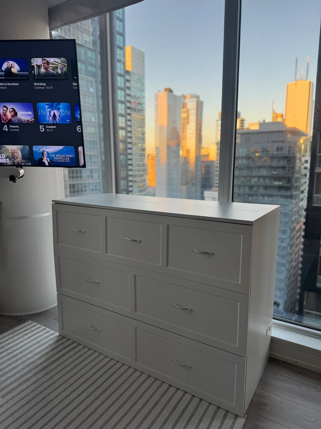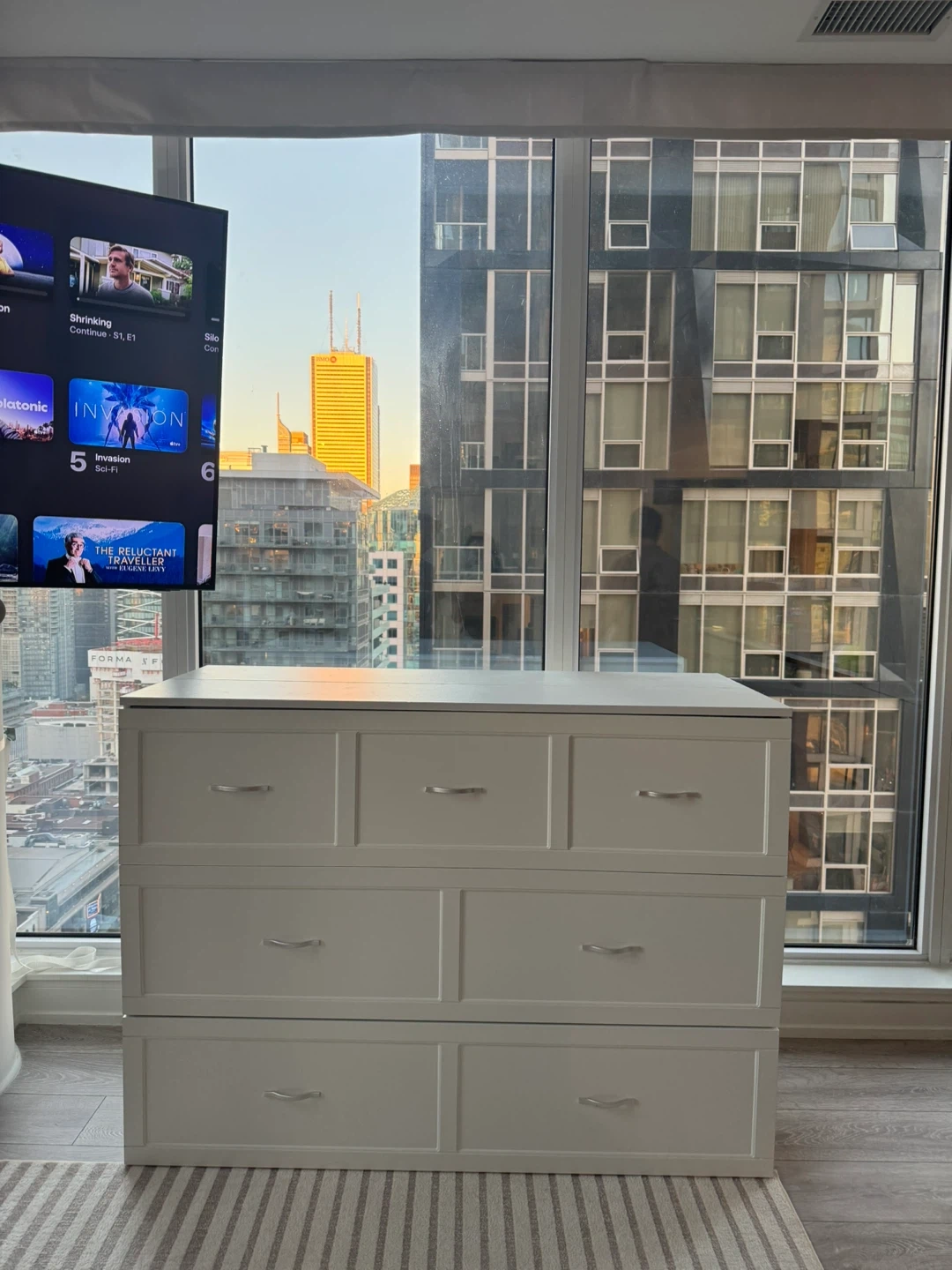 Looking to save space? This Murphy bed with dresser is a great solution! It features a white dresser that easily converts into a bed. The dimensions of the dresser are approximately 55.1" x 23.4" x 40.9". When converted into a bed, the dimensions are approximately 55.1" x 76.4" x 40.9". Full Size Bed when converted. I only use it for 6 months so it’s in great condition + no visible scratches. Price includes the Murphy Bed + the foldable mattress. *Help shipping with extra $100* Pick up Only **If you do pick up, please let me know beforehand so I can book the elevator**