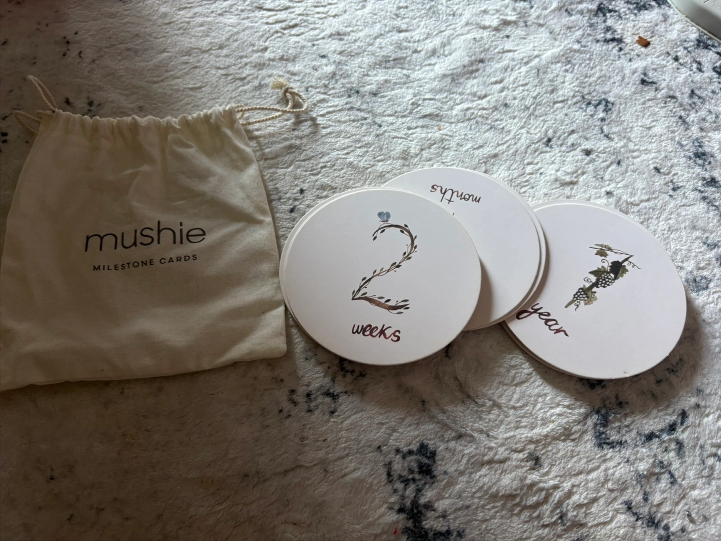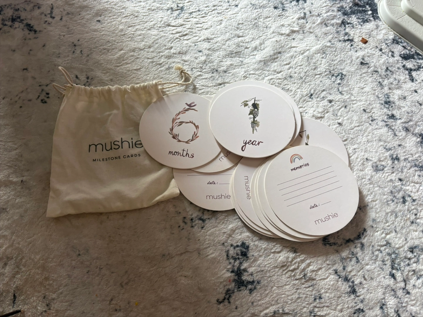 Selling a set of Mushie milestone cards! These are perfect for capturing your little one's precious moments. The set includes cards for various milestones, from weeks to months and even a year. Comes with a cute little bag for storage. I bought these with the best intentions and never used them! new, giftable condition.
