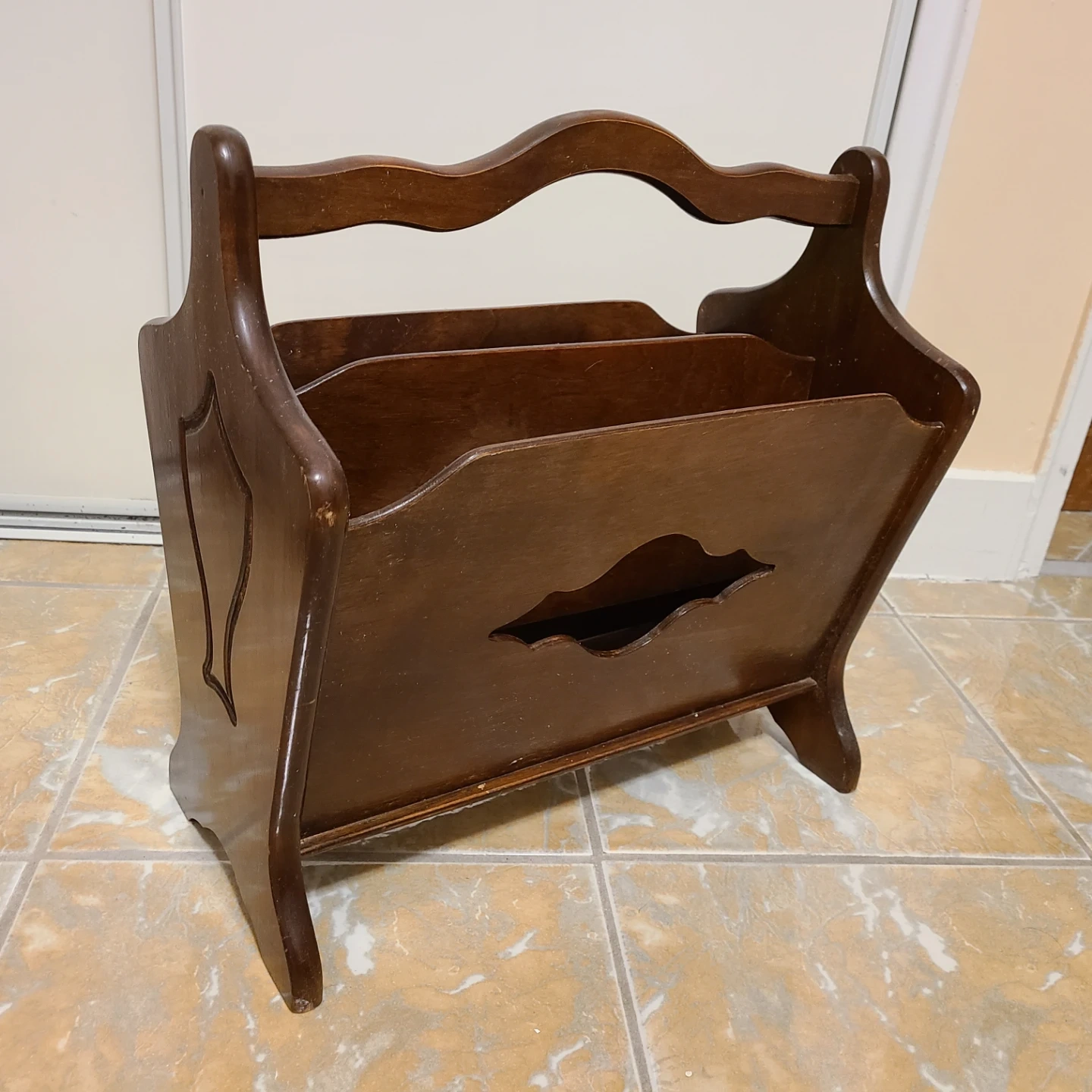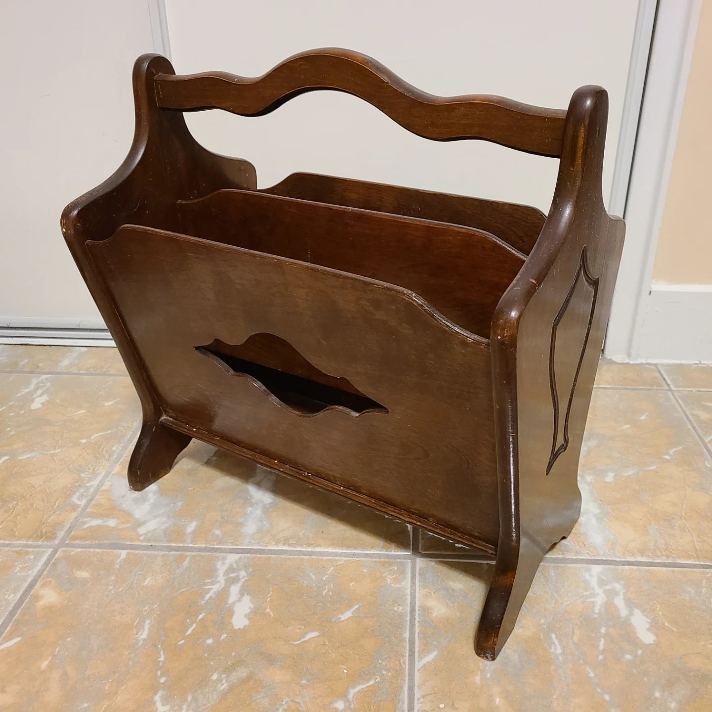 Dark wooden magazine rack with a carved design and a curved handle at the top.