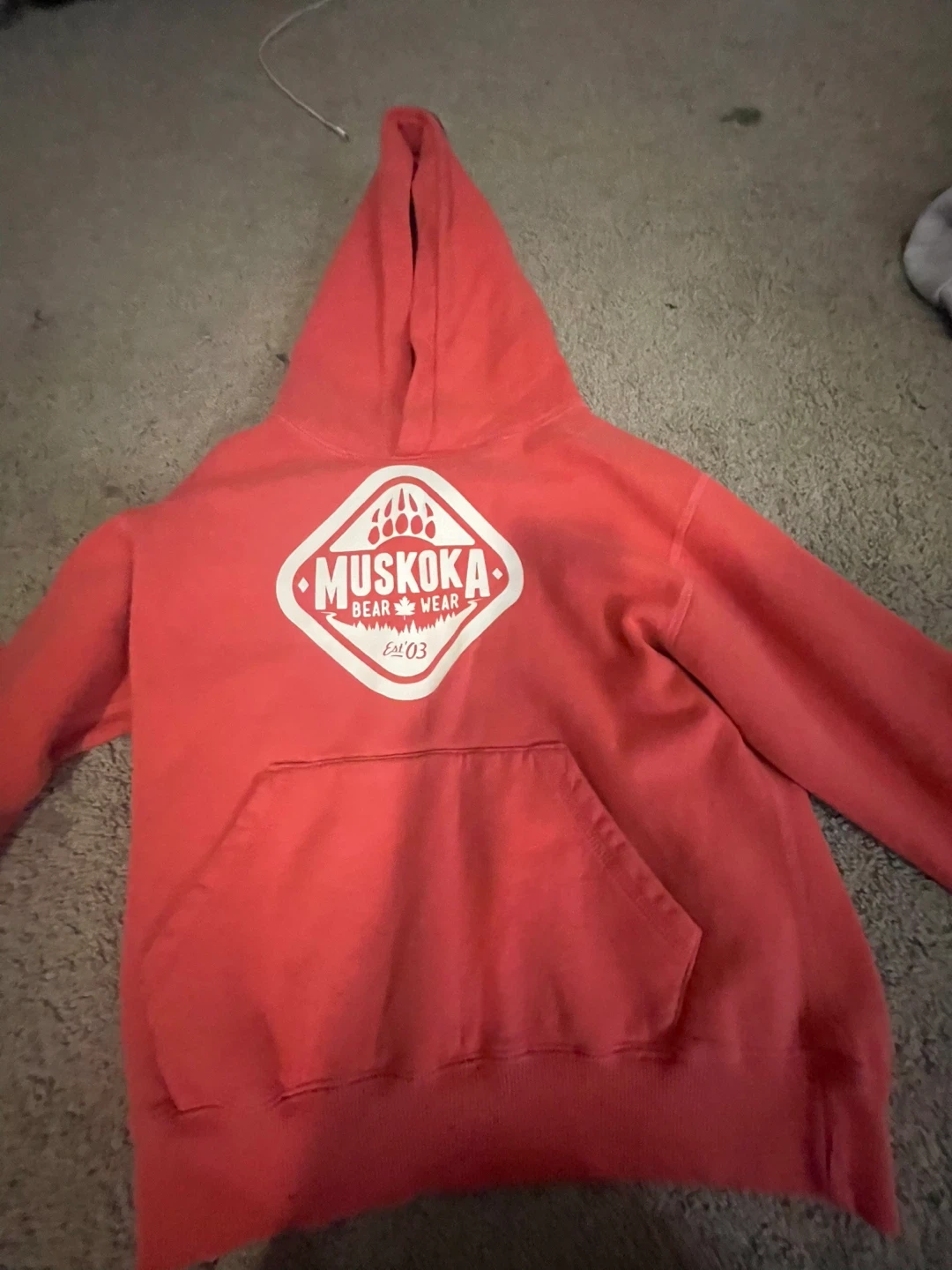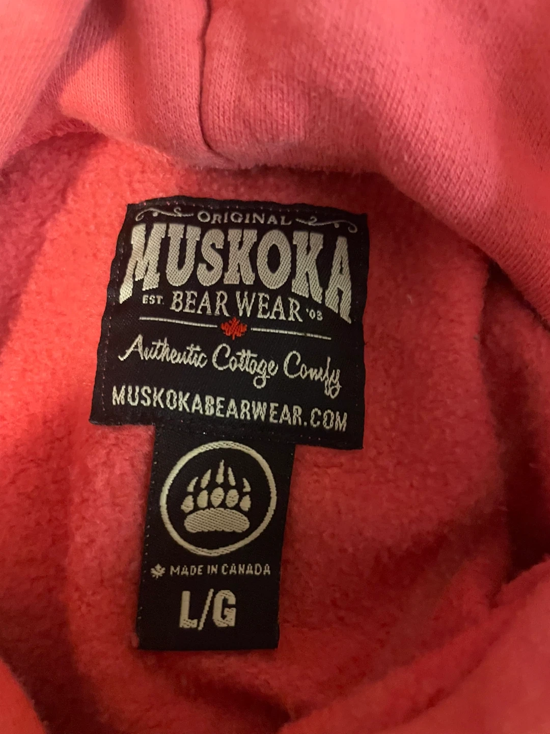 15Cozy up in this authentic Muskoka Bear Wear hoodie! It's a size large/grande and in a vibrant coral colour. Perfect for cottage vibes or just staying comfy at home. Made in Canada!