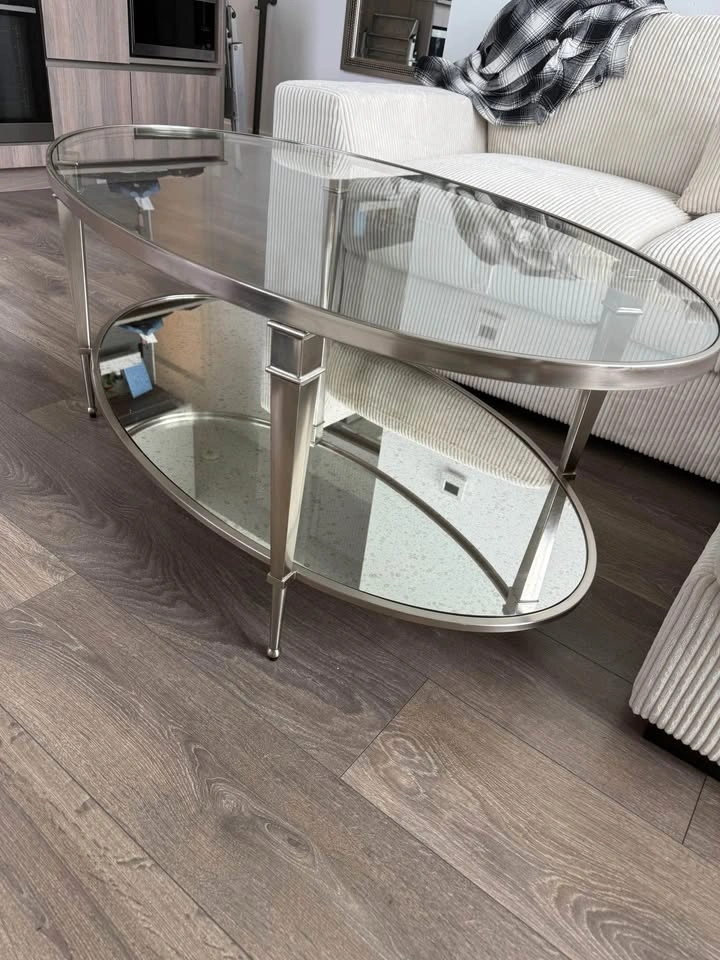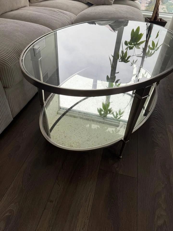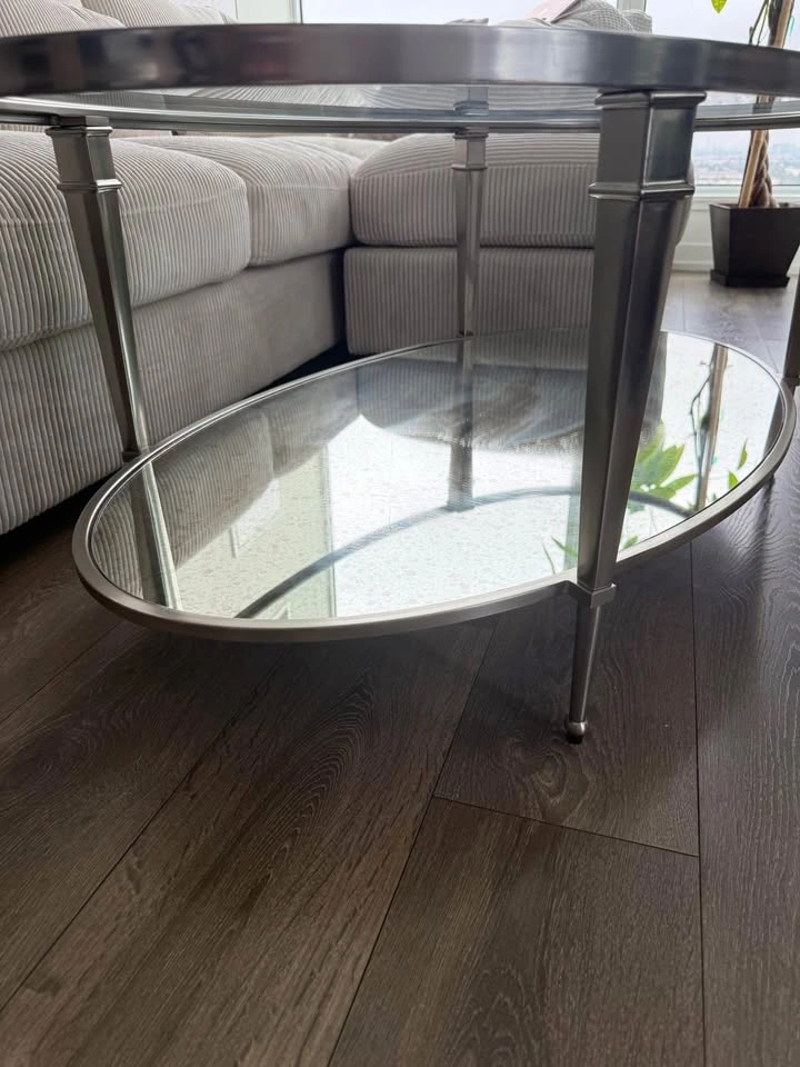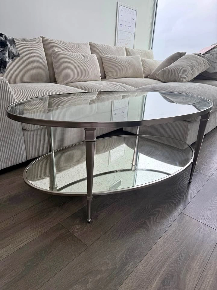 Beautiful oval coffee table with a glass top and antique mirror lower shelf. Solid and heavy piece that instantly makes a room feel more elevated. It’s in great condition, I just changed my furniture and it feels a little too big for my space now. Measurements 48” x 28” Pick up near Highway 7 & Jane.