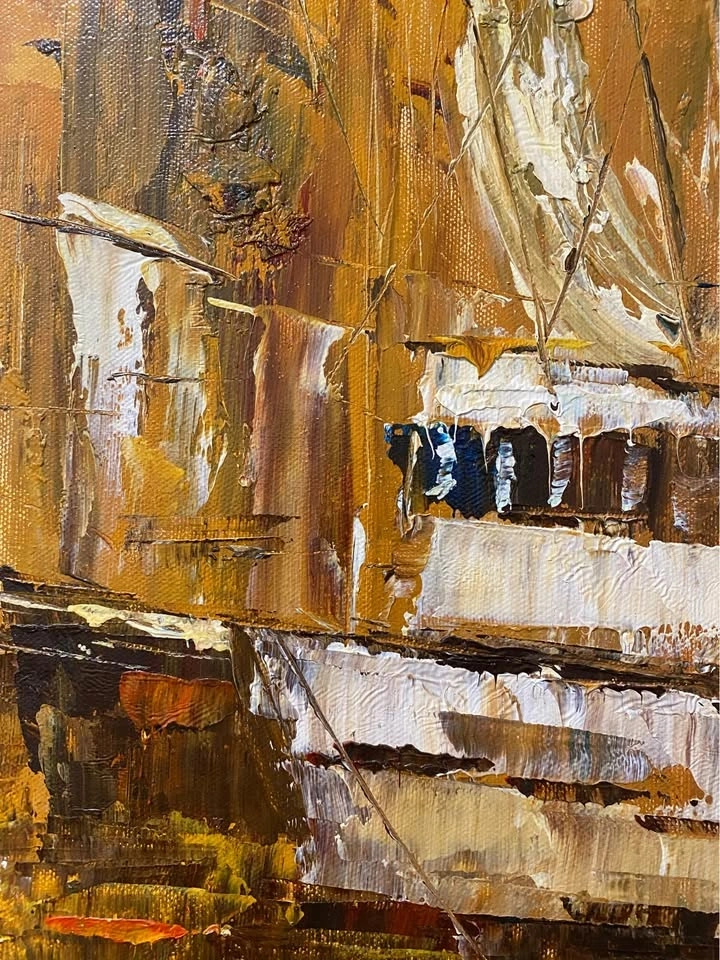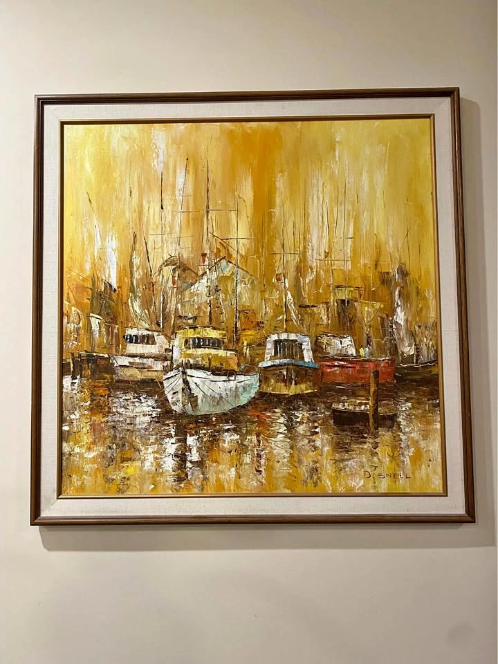 Large Vintage Oil Painting - Harbor Scene (41x41, Signed)