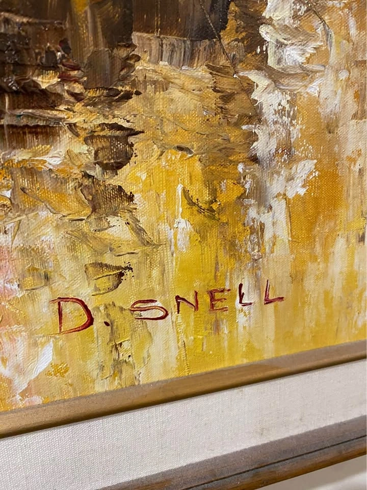 Large framed oil painting with heavy texture and warm tones. Signed by D. Snell. This is a real statement piece and looks even better in person. Measures 41" x 41". Frame is included.
