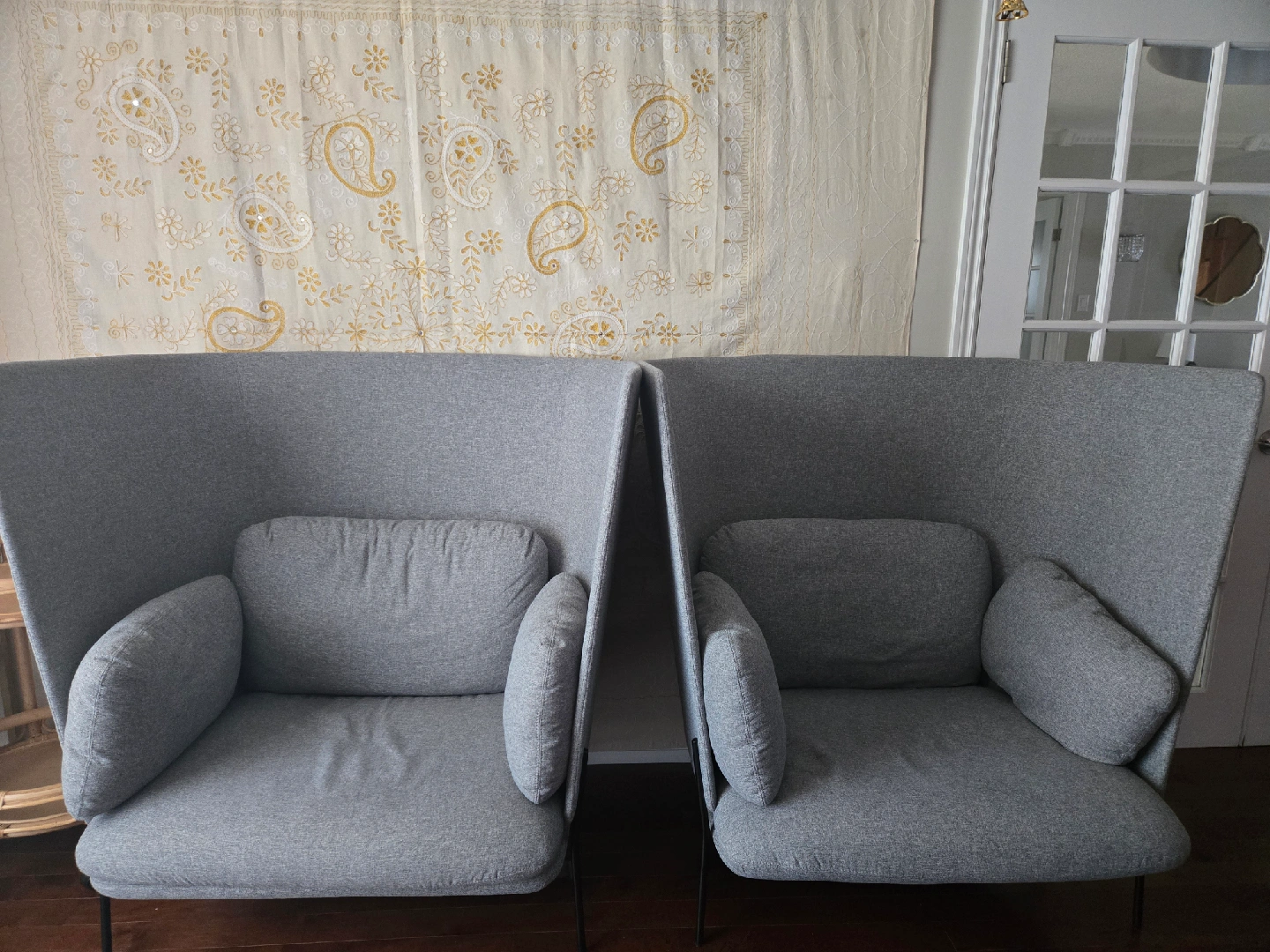 10Selling rarely used 2 KODE brand Muuto Oslo armchairs in light grey. It's in great condition and has a unique, modern design that would look great in any space. The chair is very comfortable and perfect for relaxing or reading a book ! Paid 750$ each from Hudson BAY. High quality. Very sturdy with metal body and legs. Heavy need 2 people to move. Soft fabric. 1 for 160$. 2 for 300$. No stains. FROM SMOKE AND PET FREE HOUSE.