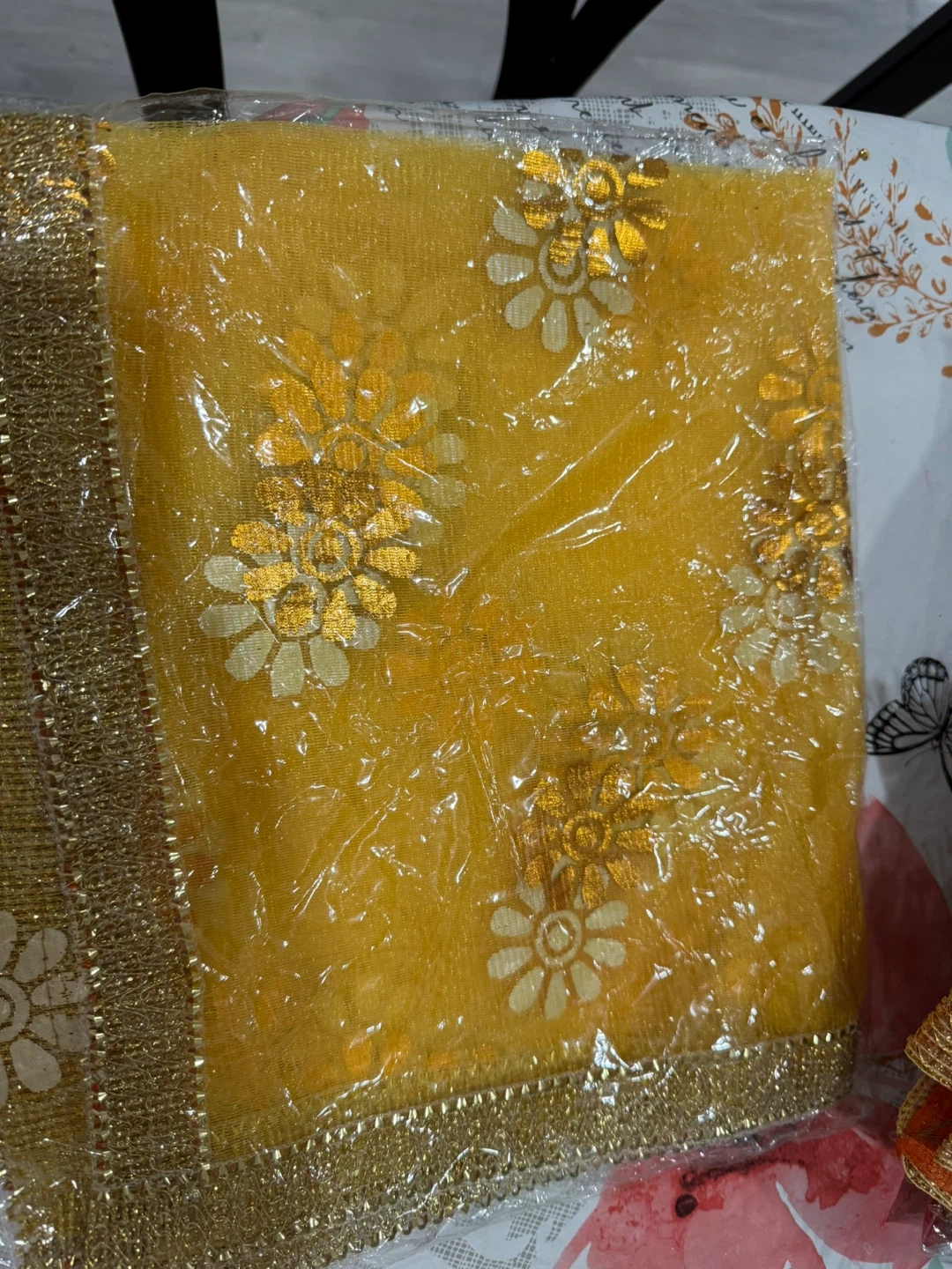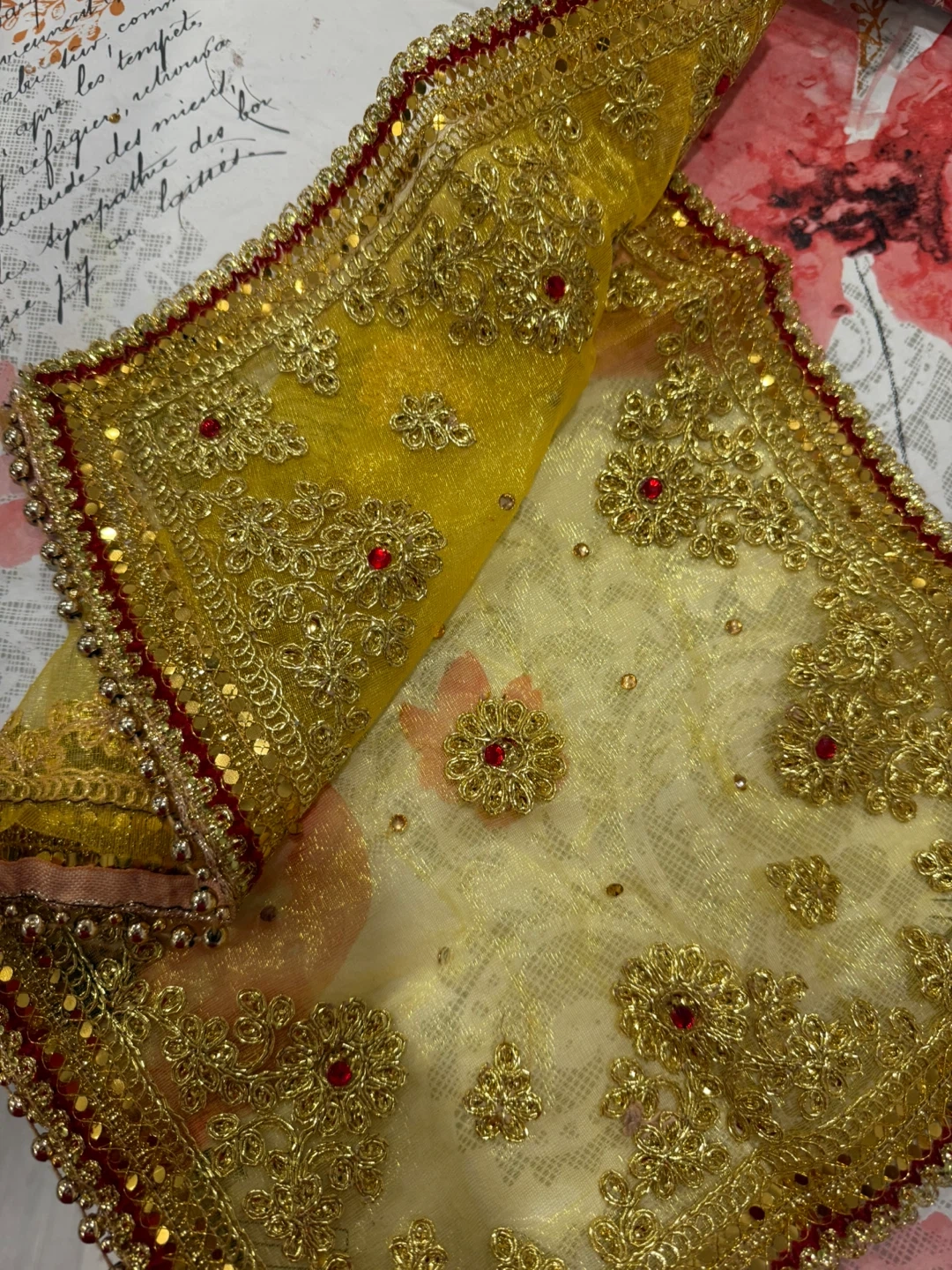 This lot includes three embellished fabric pieces. Designs feature gold thread embroidery, sequins, and colourful beads. These fabrics are ideal for crafting projects or as decorative accents.