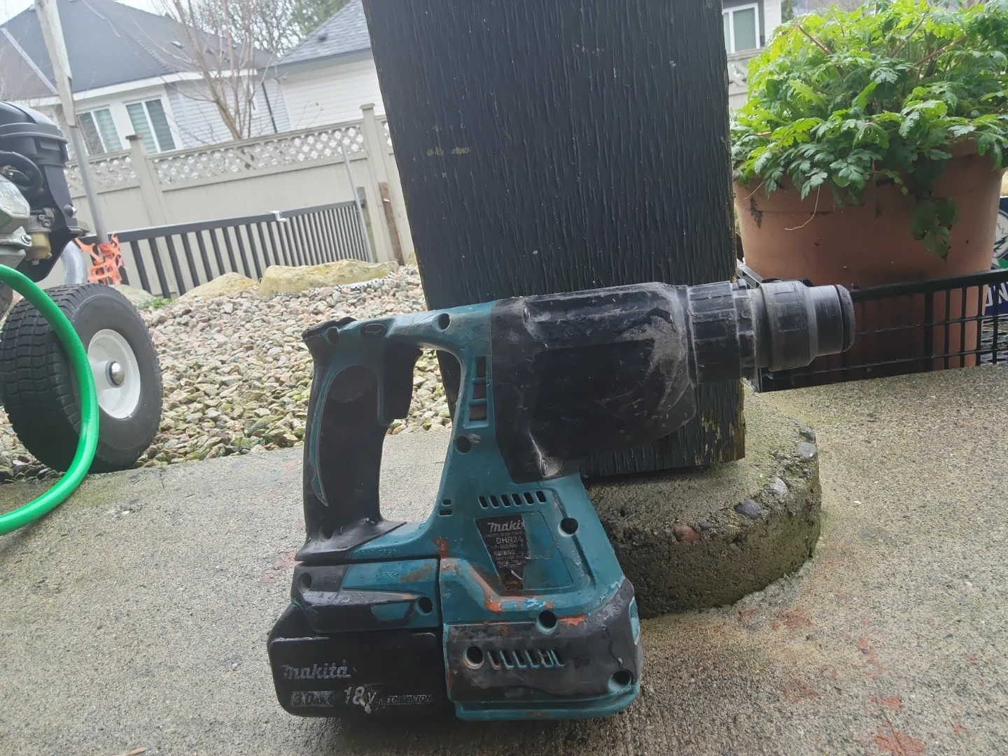 This is a Makita DHR24 hammer drill with an 18V battery. It has a 3.0Ah battery. It's a cordless tool for drilling and hammering tasks.