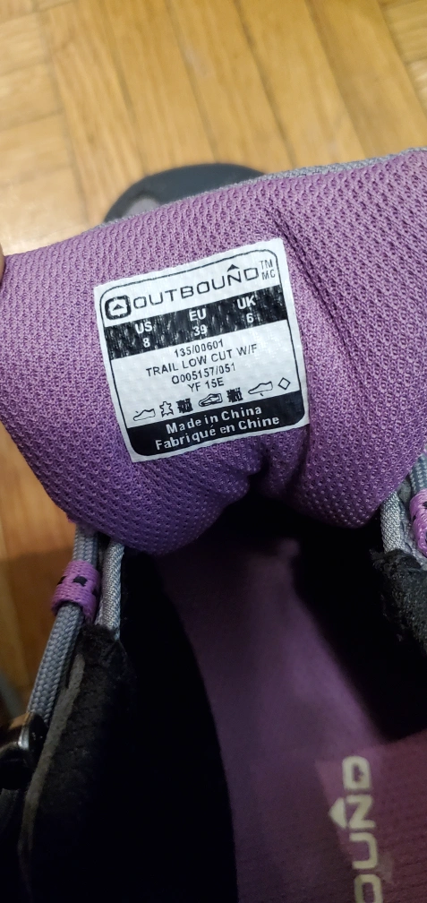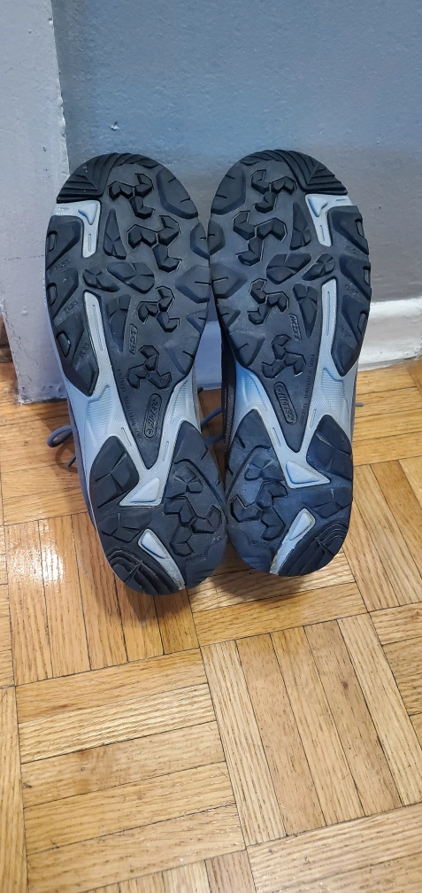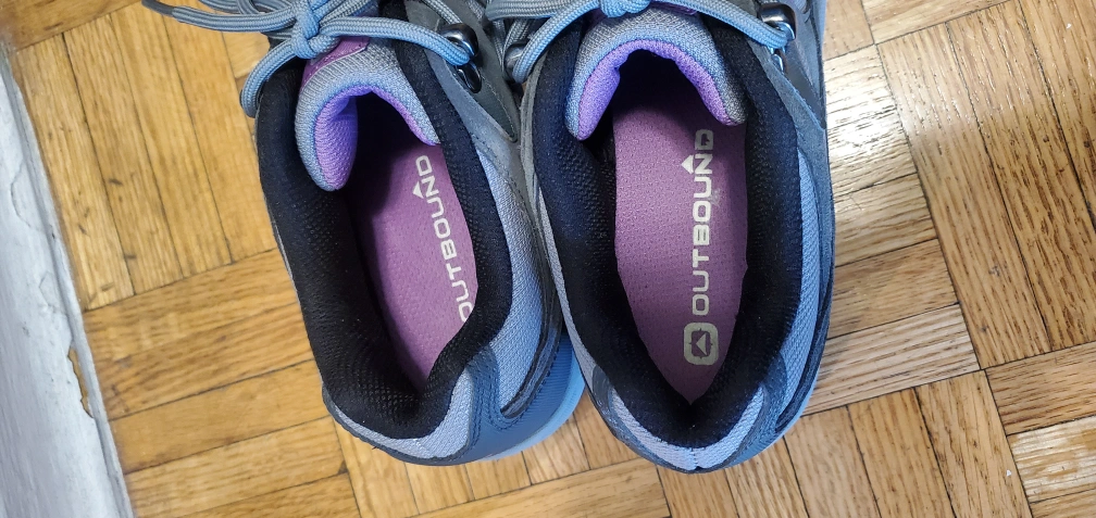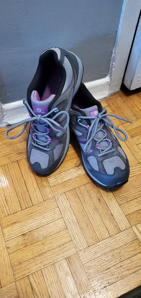Gray and purple hiking shoes. Lace-up. Comfortable and supportive.