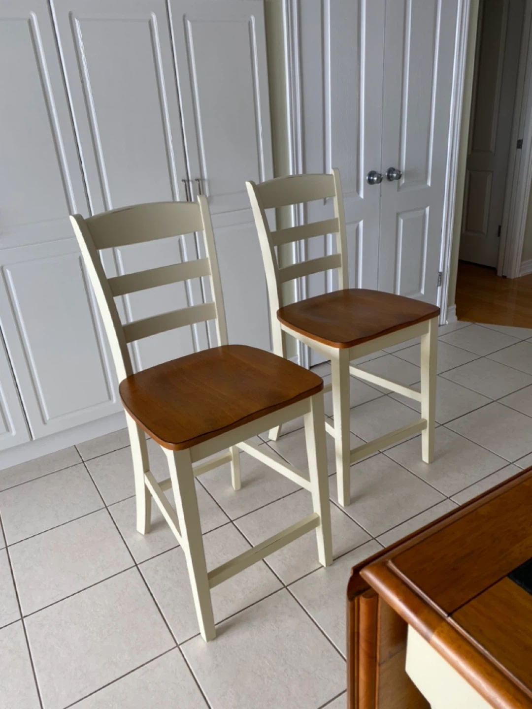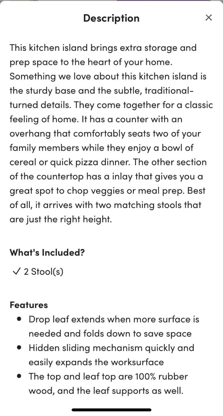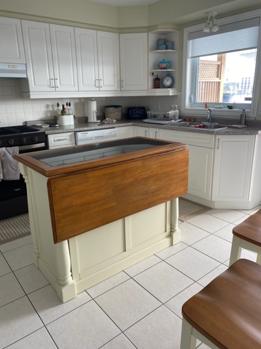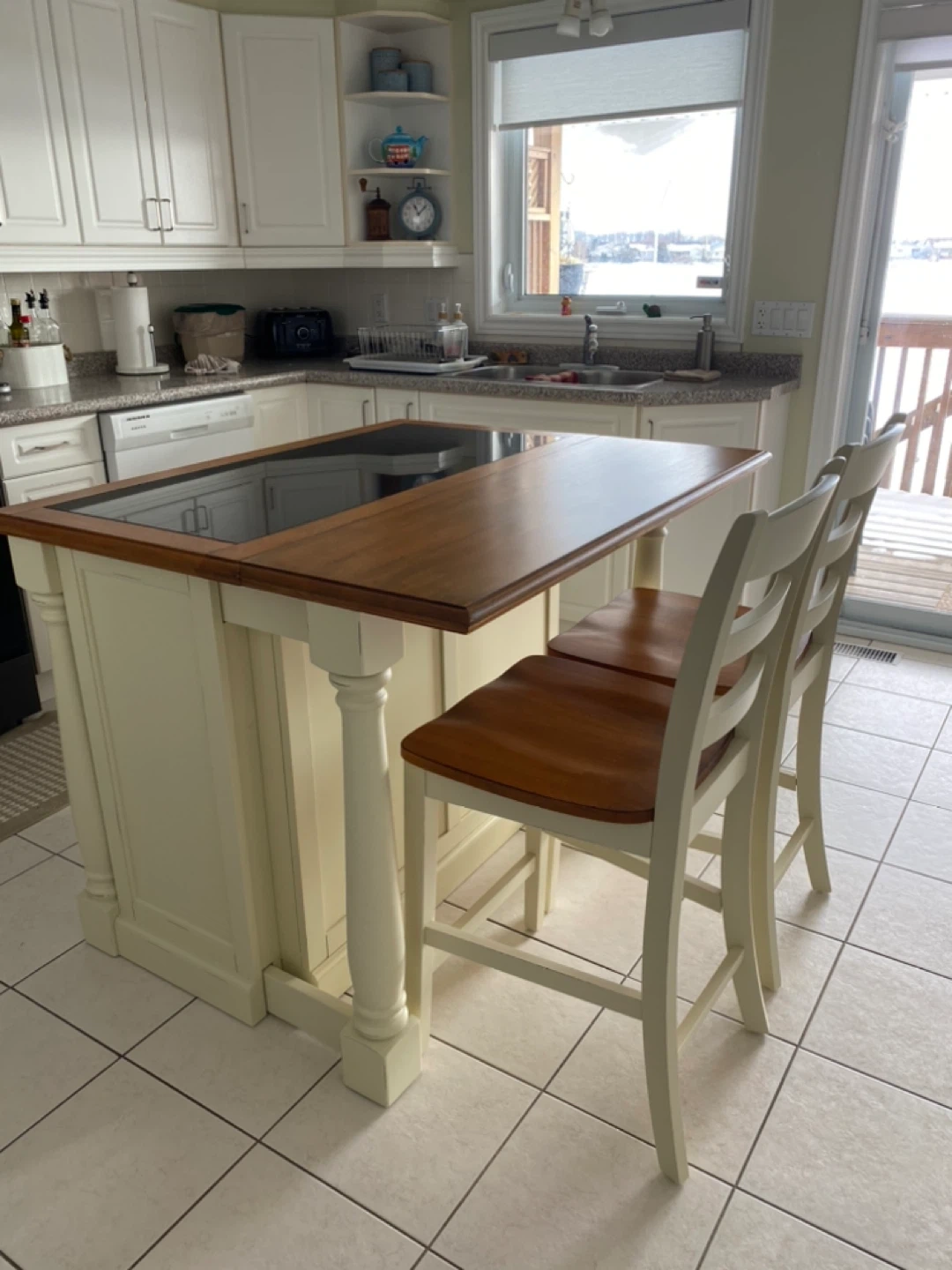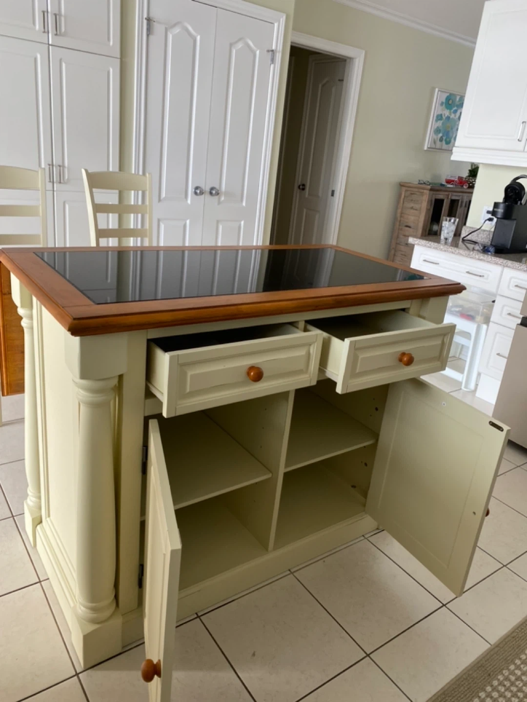 Beautiful and sturdy kitchen island set featuring a granite inlay prep area and ample storage cabinets. It includes two matching bar stools. There's a drop-leaf extension for eating. SEE PHOTOS FOR MEASUREMENTS AND MORE DETAILS.