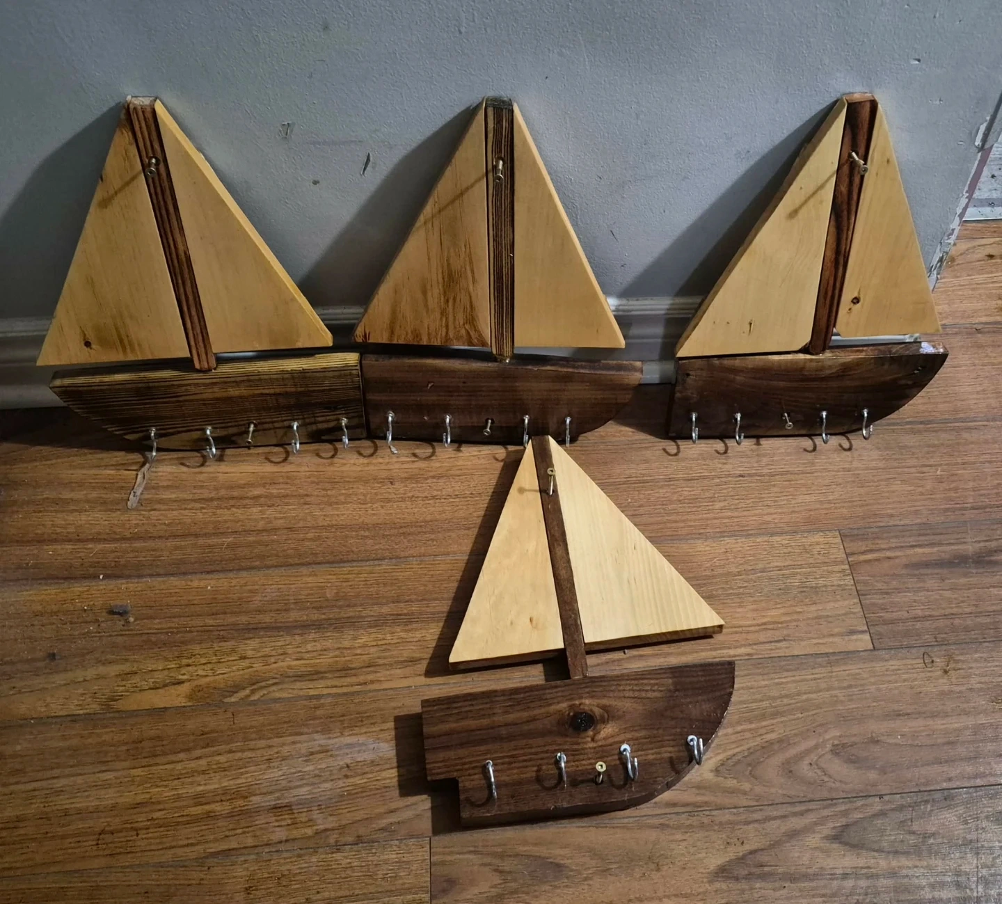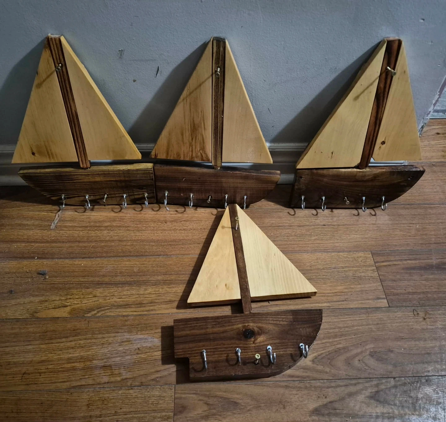 Set of four handmade wooden sailboat key holders. Features multiple hooks on each for organizing keys. Made from a mix of light and dark wood tones.
