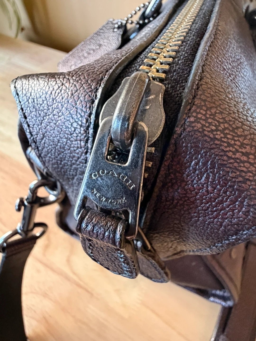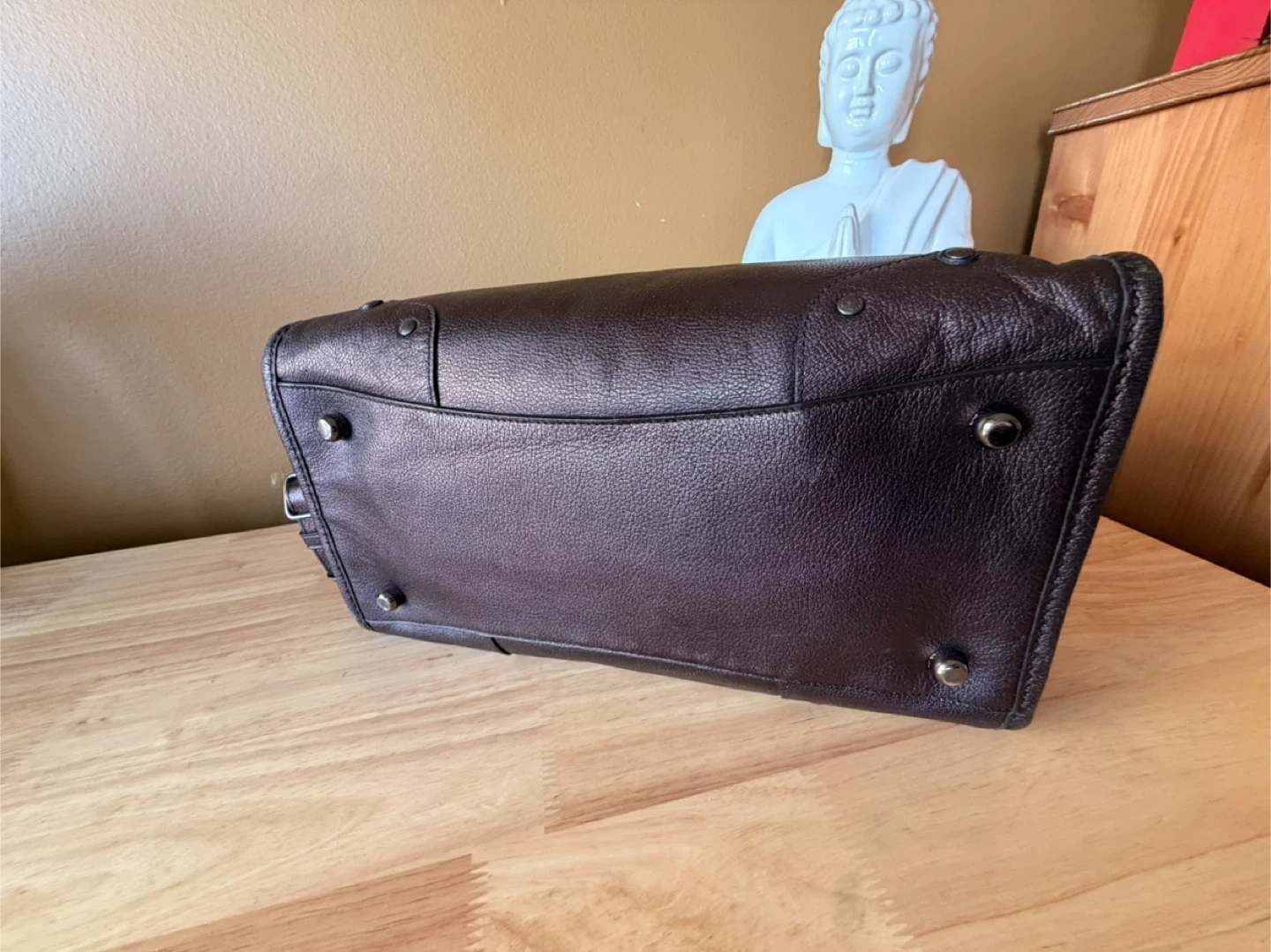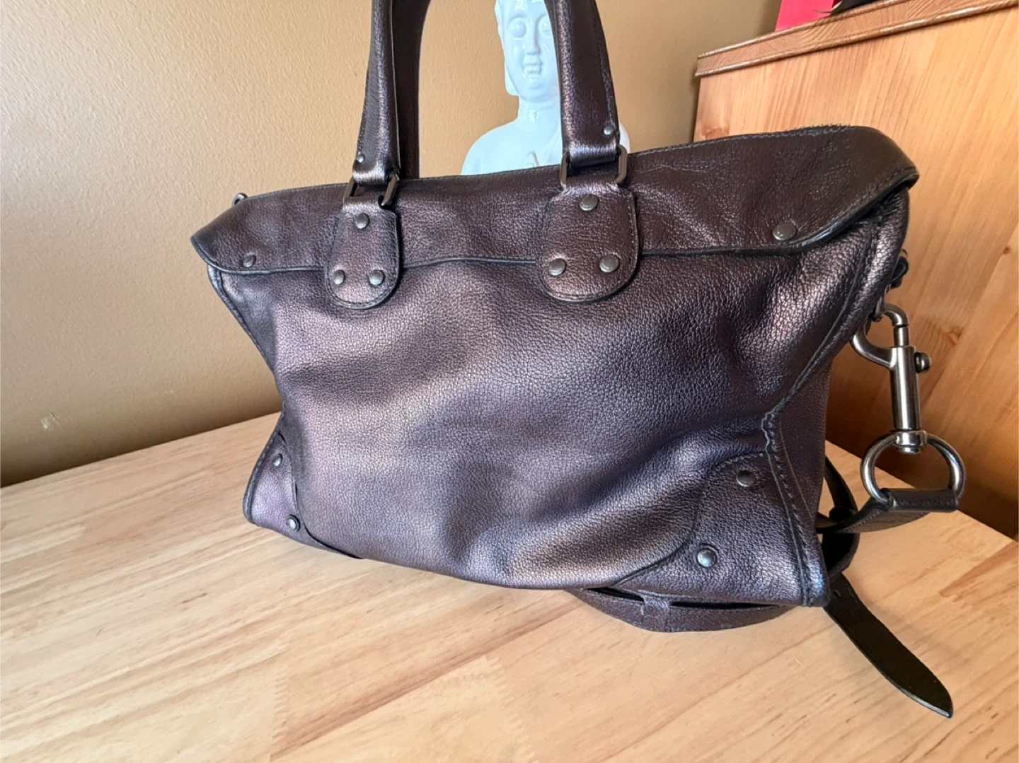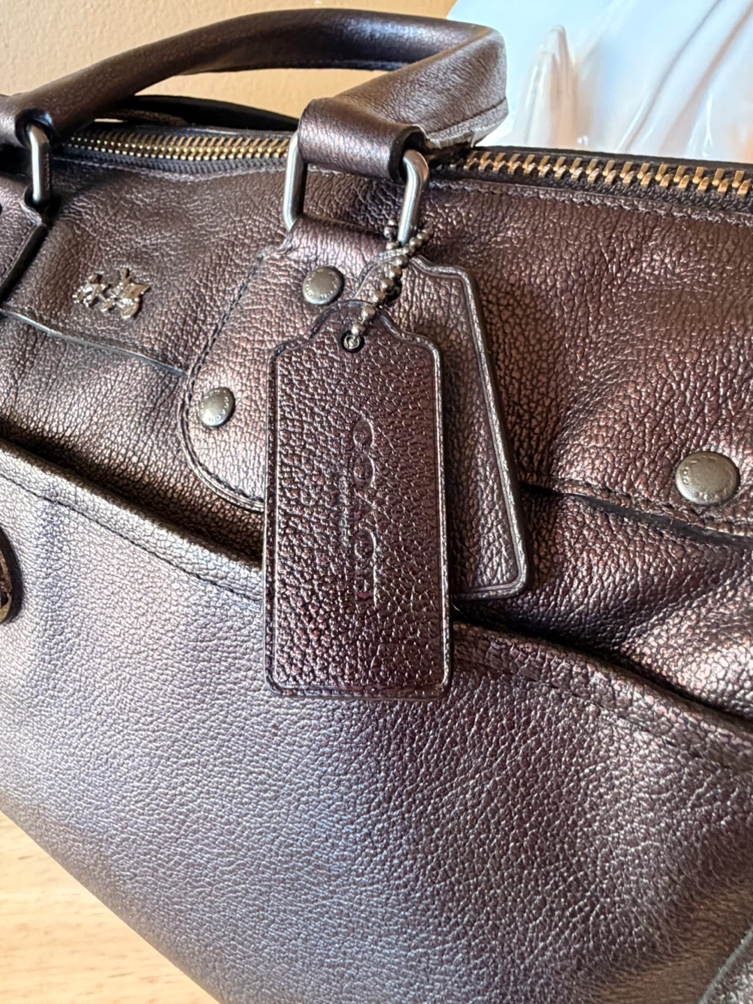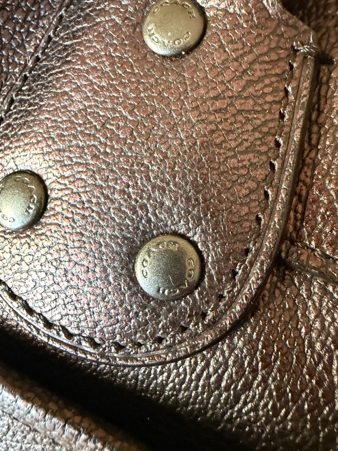 A stylish Coach satchel bag in a metallic bronze leather. It features a turn-lock closure and a detachable shoulder strap. This bag is made of genuine leather.