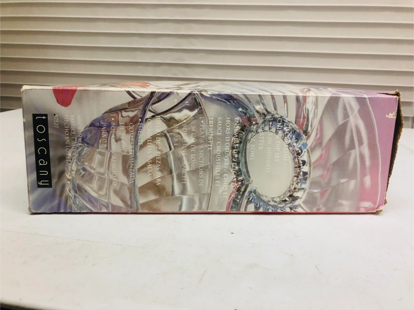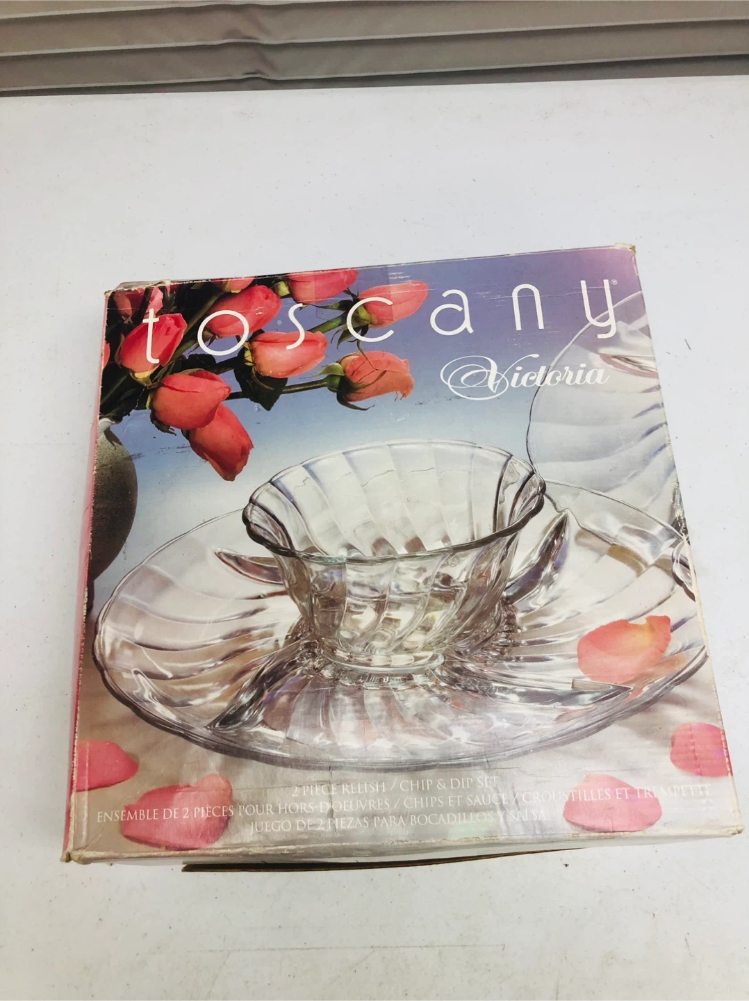 This is a Tuscany Victoria 2-piece chip and dip serving set. It's made of clear glass. Includes the bowl and the divided tray.