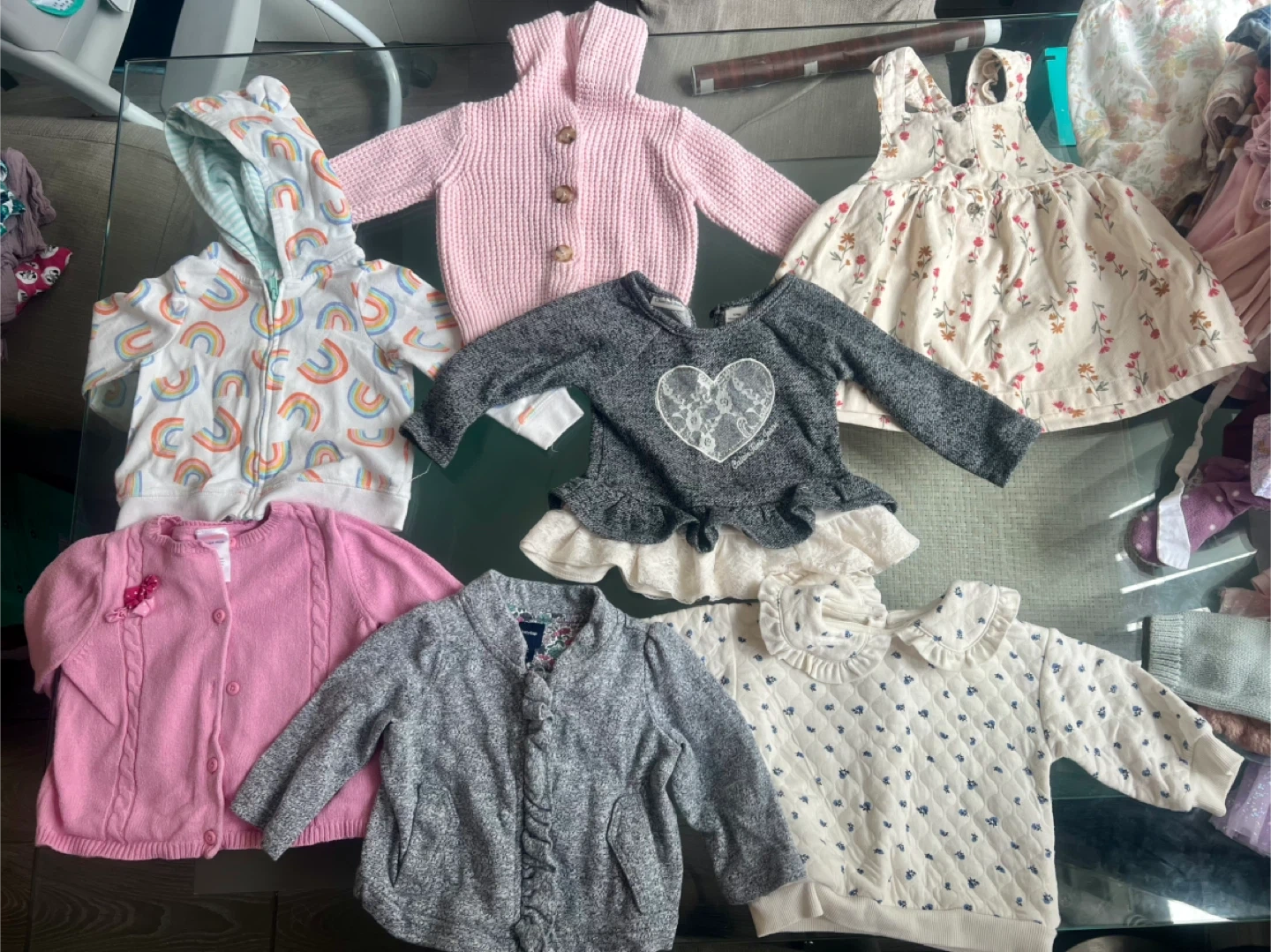 A variety of cute and gently used baby girl outfits and separates for 6mos onwards Includes dresses, pants, tops, and outerwear. All for $90.