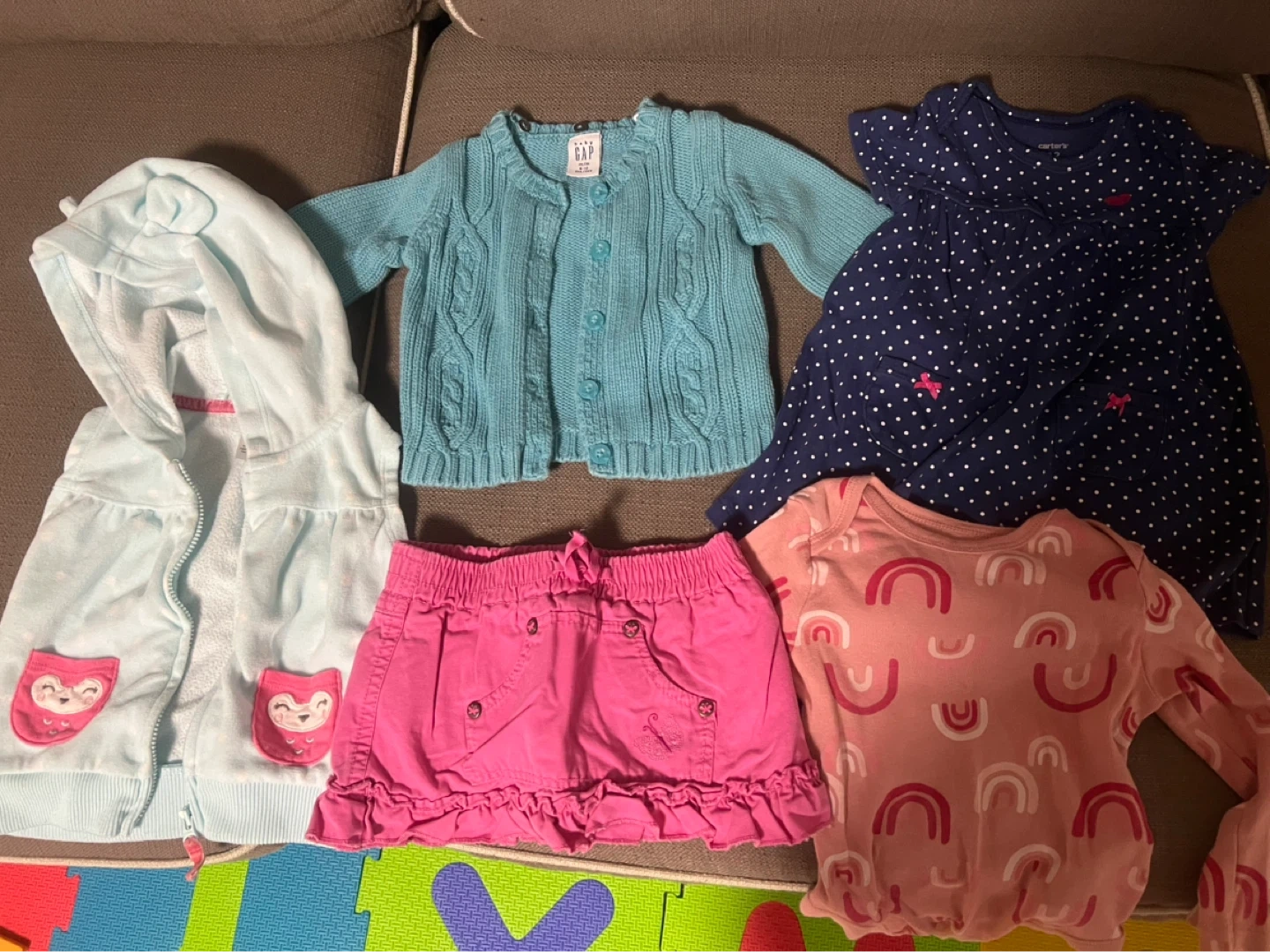 More than 60pcs of mixed clothes. Brands are calvin klein, tommy hilfiger, baby gap, carters, baby Bgosh (osh kosh), Disney, Gymboree, etc.