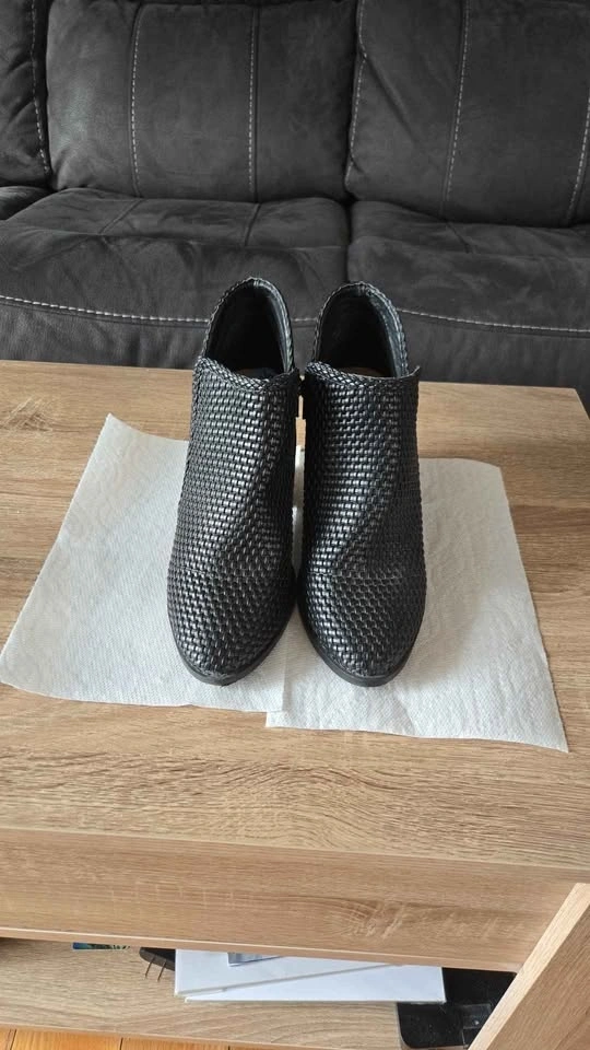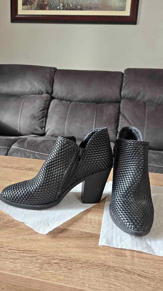 Stylish black woven ankle boots with a cool textured design and block heels. Side zippers make them easy to put on. Great for many outfits. Brand new. Pick up in Niagara Falls. From a pet and smoke-free home.