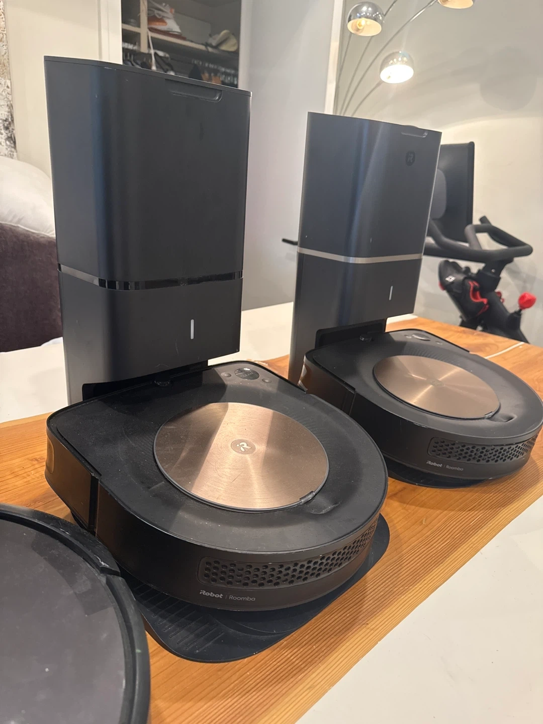 Frozen in app ( good for parts or fix) One iRobot Roomba robot vacuums with Clean Base charging docks included. These are black with rose gold accents. They're designed for automatic dirt disposal.