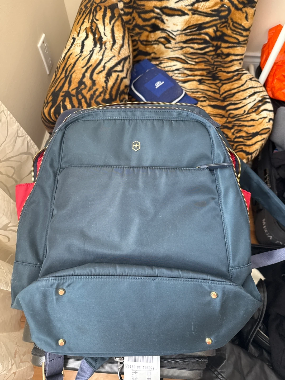 This is a dark blue Victorinox backpack. It's made of nylon material. It has multiple zippered compartments.