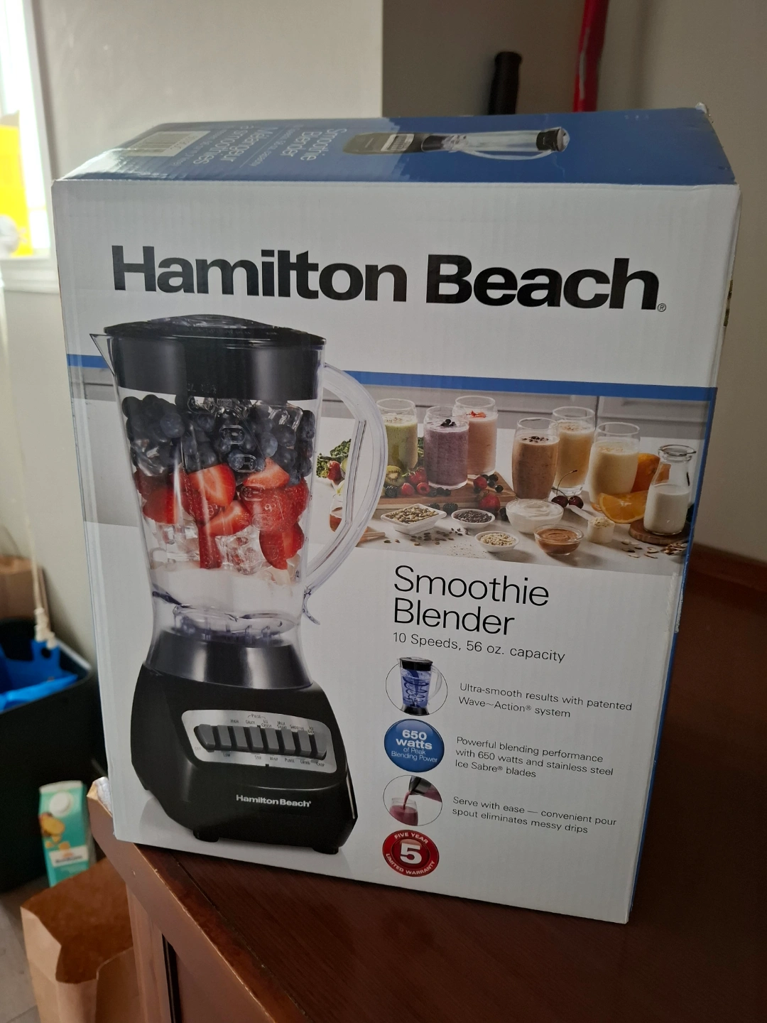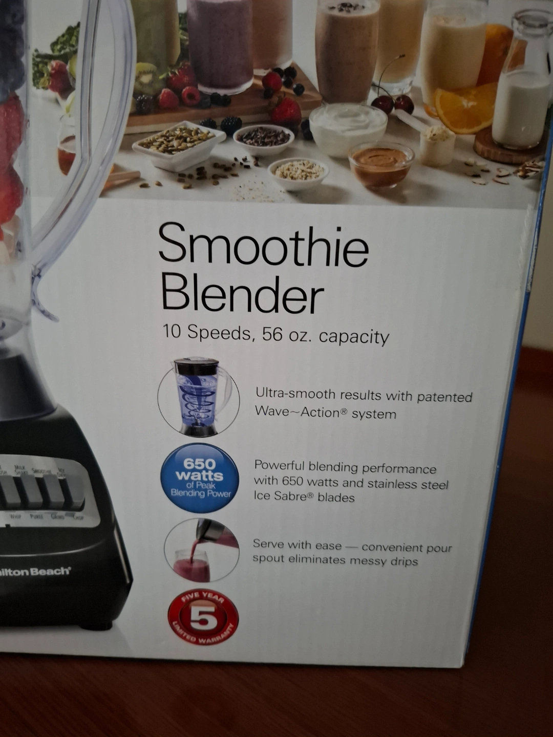 New in box. Hamilton Beach smoothie blender. Features 10 speeds, 650 watts of power, and a 56-ounce capacity. Patented Wave-Action system for ultra-smooth results. Includes stainless steel Ice Sabre blades. Convenient pour spout.