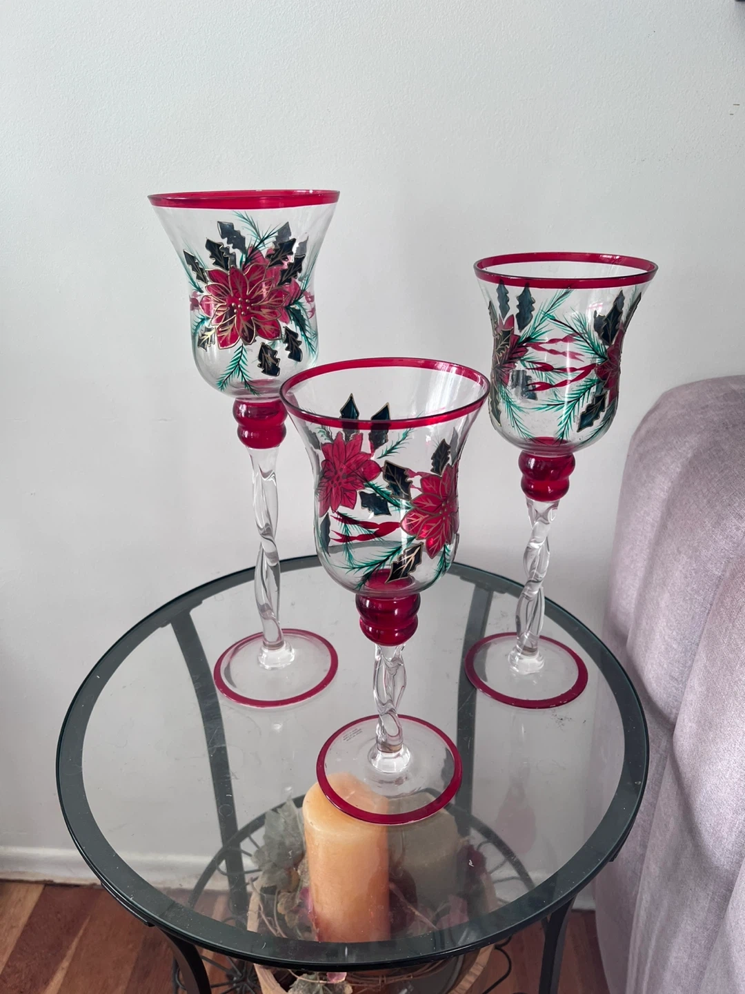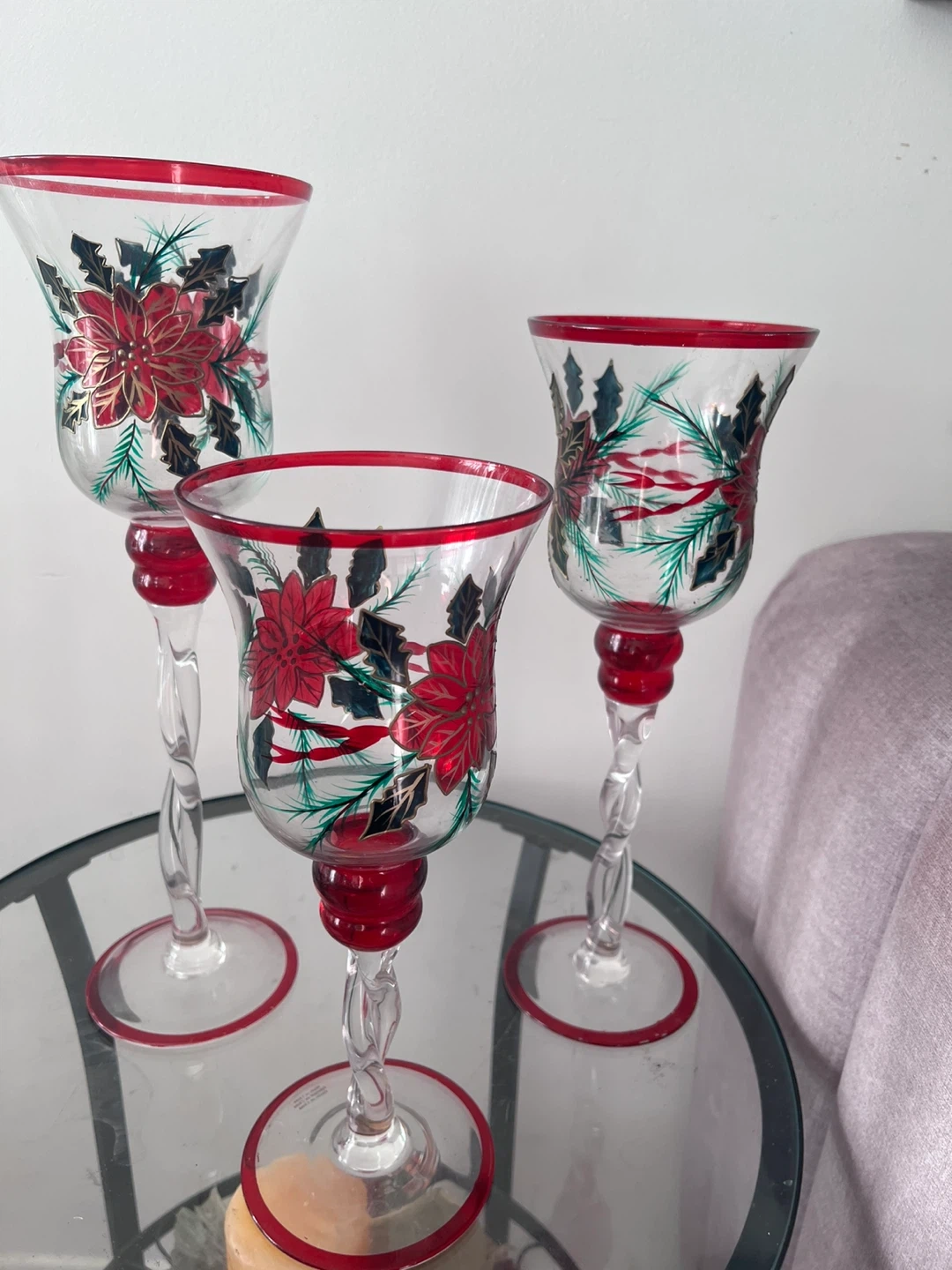 Selling a set of three Christmas candle holders! They feature a lovely floral design in red, green, and white, perfect for adding a festive touch to your home this holiday season. They're in great condition and ready to brighten up your space