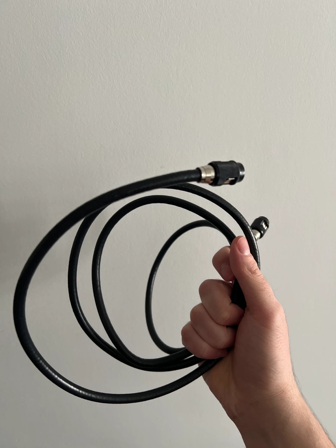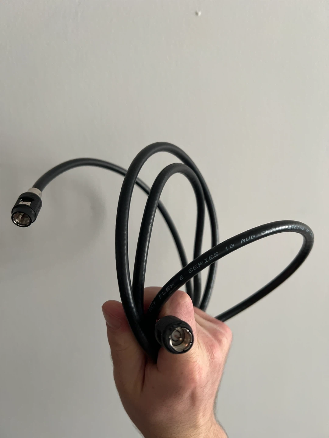 This is a black RG6 coaxial cable. It's 18 AWG and Flex 6 Series. The connectors are secure and it's ready to be used for your TV or internet setup.