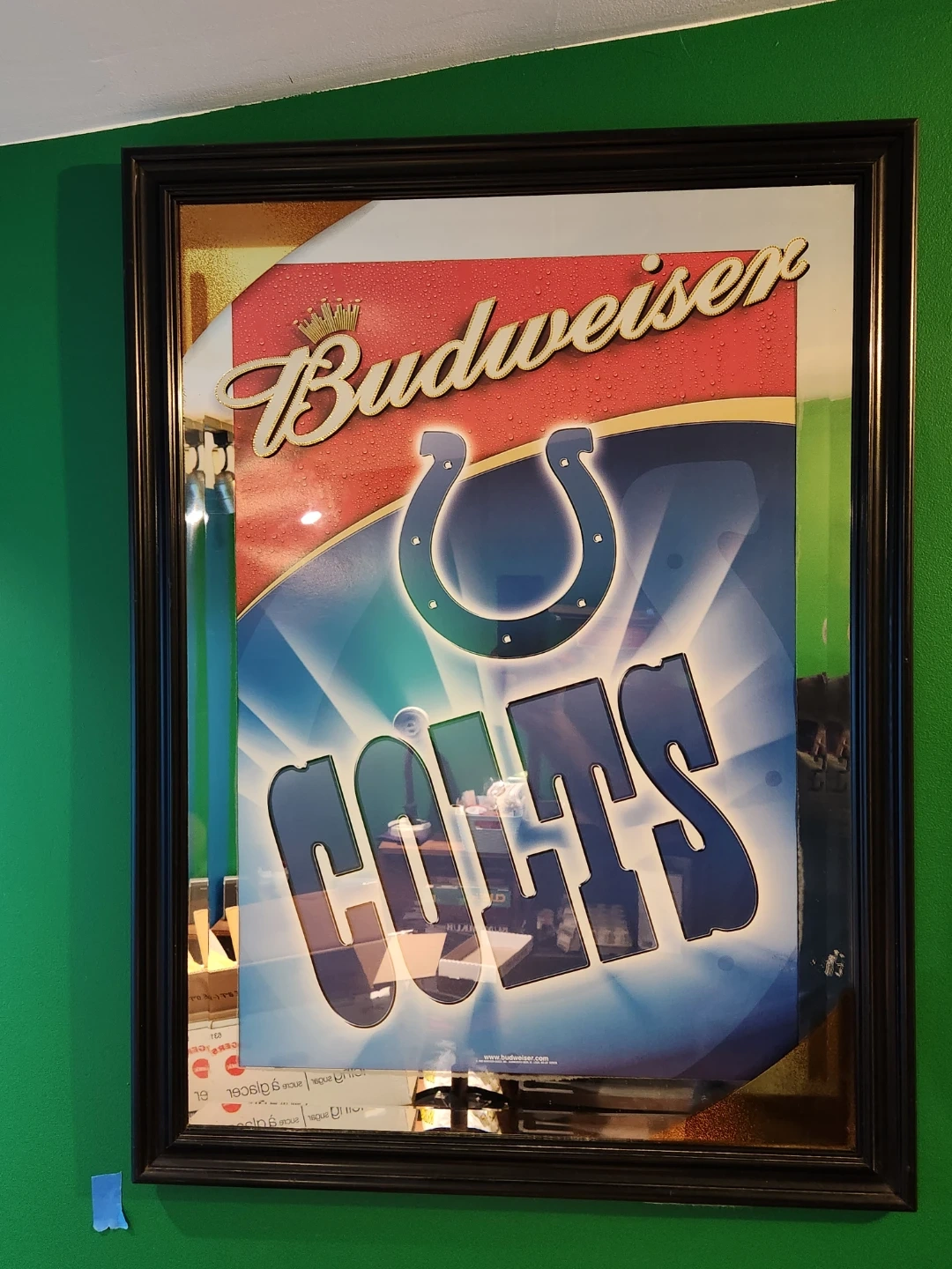Selling a Budweiser and Indianapolis Colts framed mirror. It measures approximately 23 inches wide by 31 inches tall. It's in great condition!