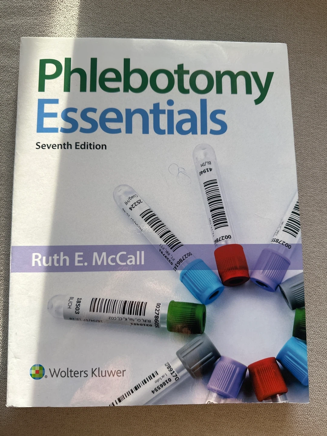 This is the seventh edition of Phlebotomy Essentials, authored by Ruth E. McCall. It's a textbook covering essential phlebotomy procedures and knowledge. Published by Wolters Kluwer.