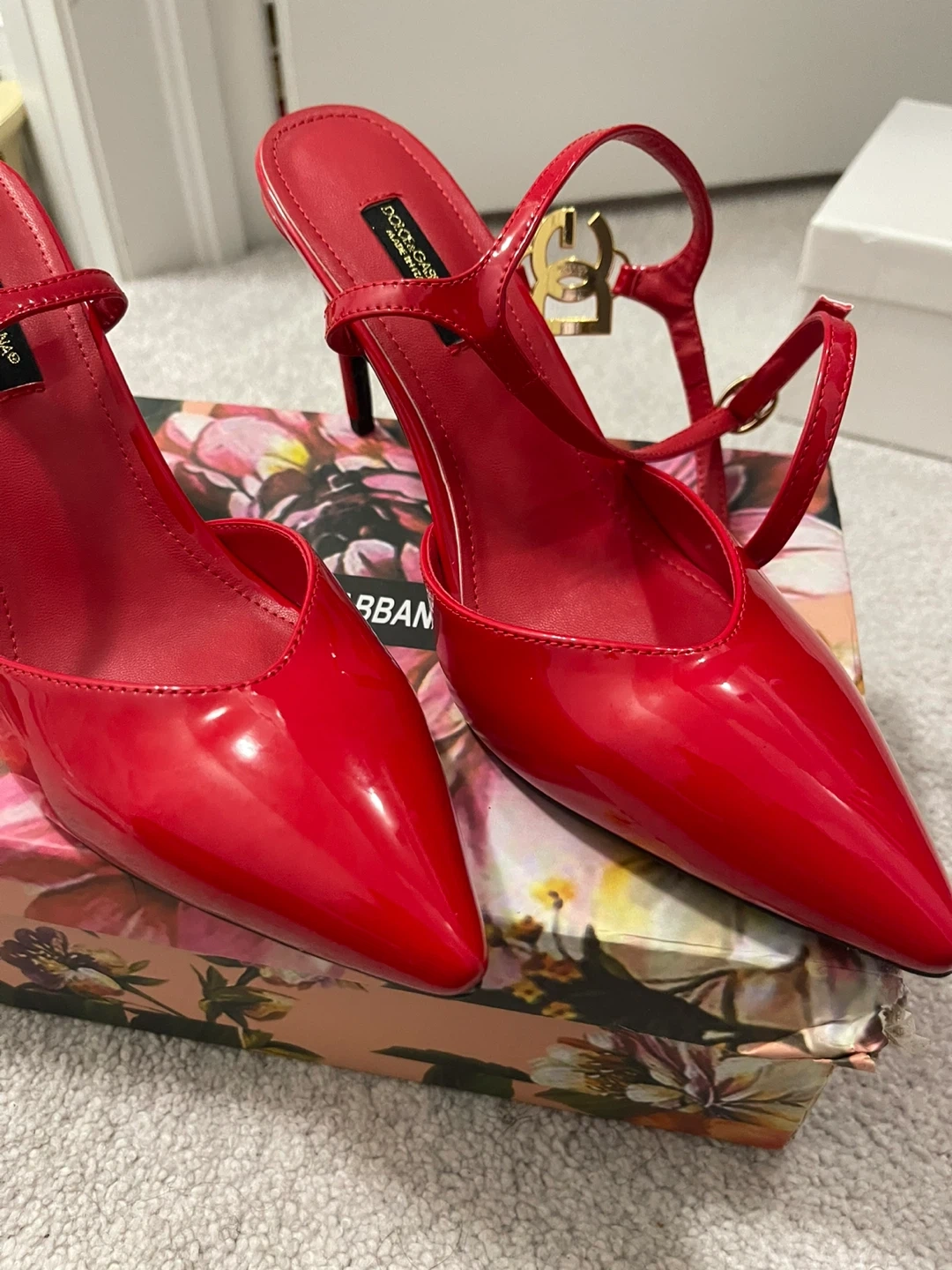 These Dolce & Gabbana heels are a vibrant red patent leather! They feature an ankle strap and a pointed toe. Comes with the original box and dust bag