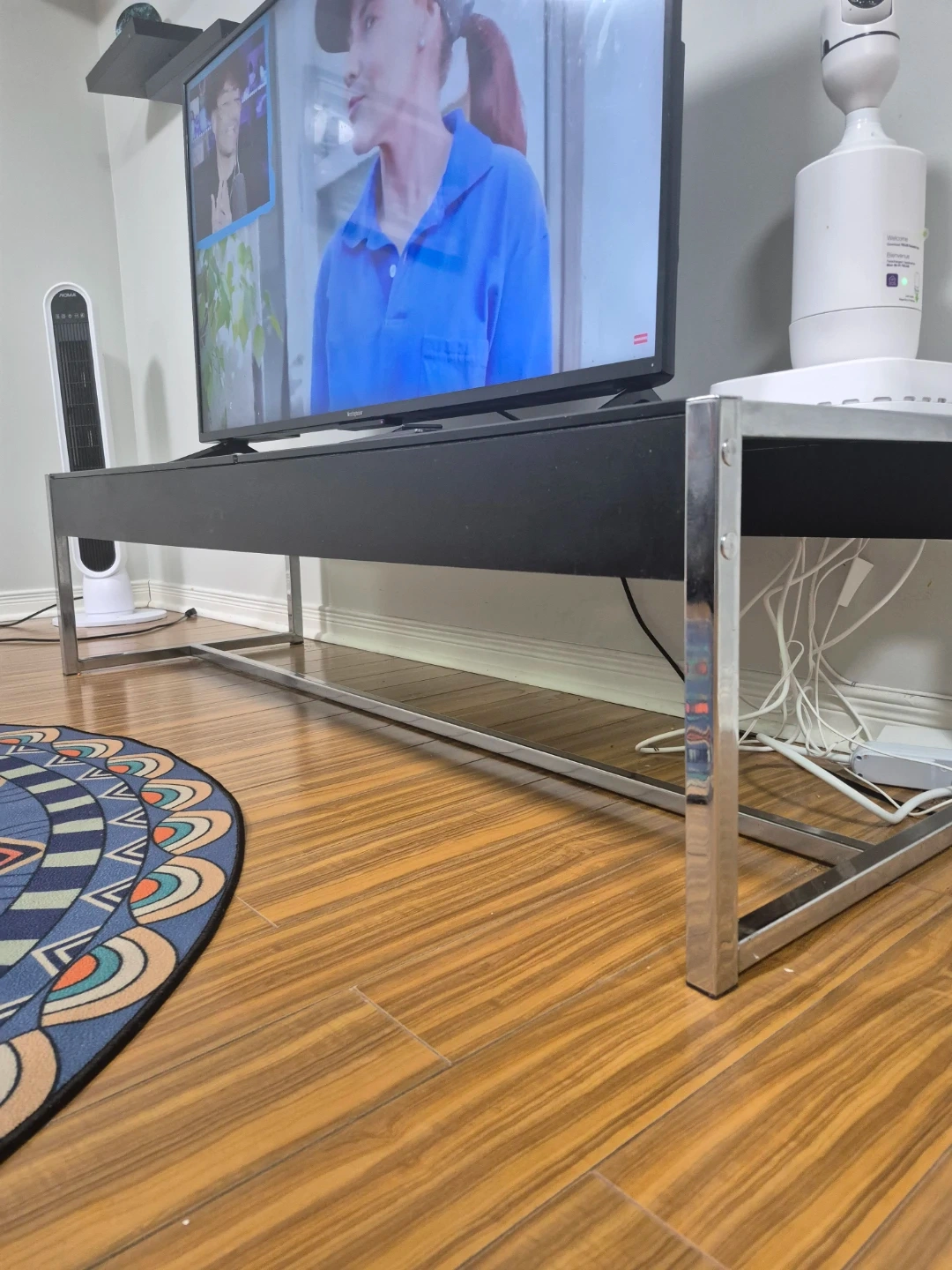 Selling a TV stand in black. It has a sleek design with a silver frame. Perfect for any living room setup!