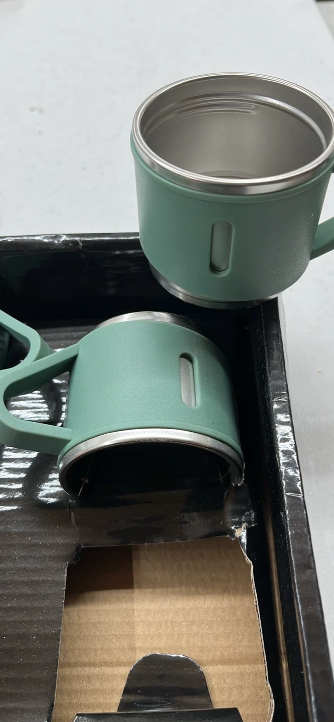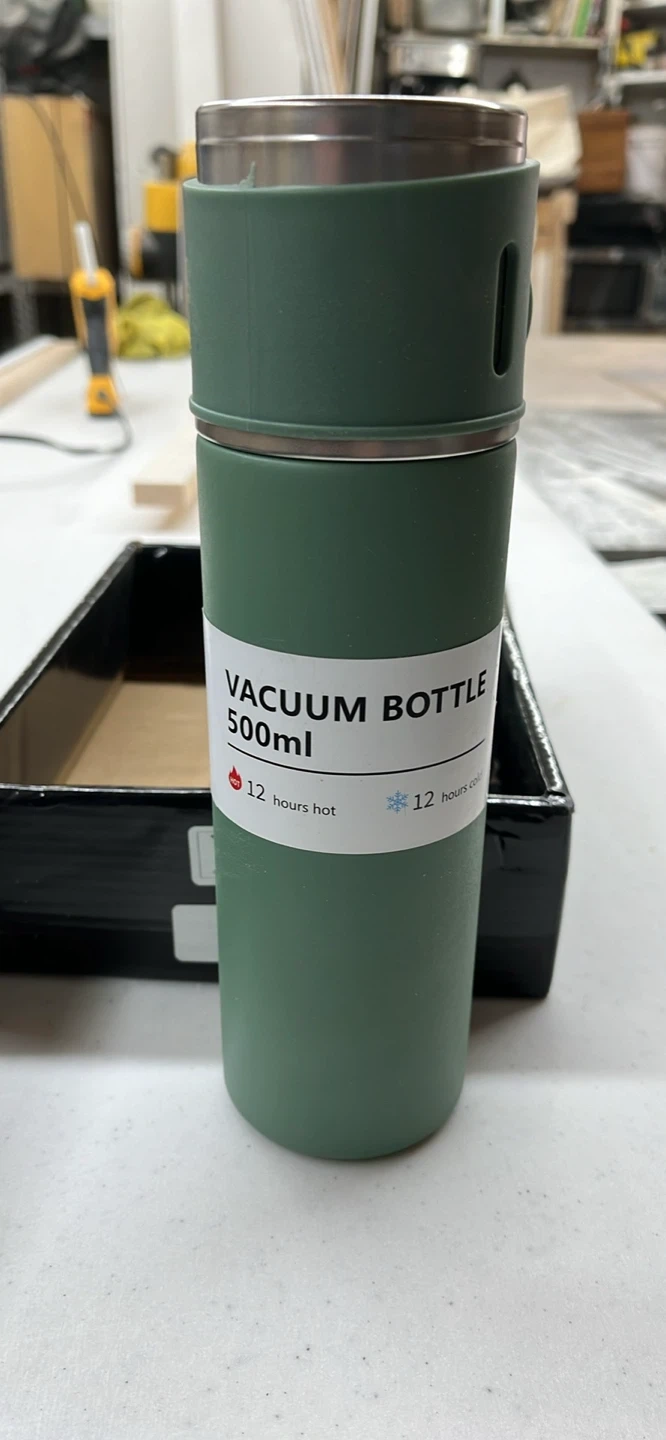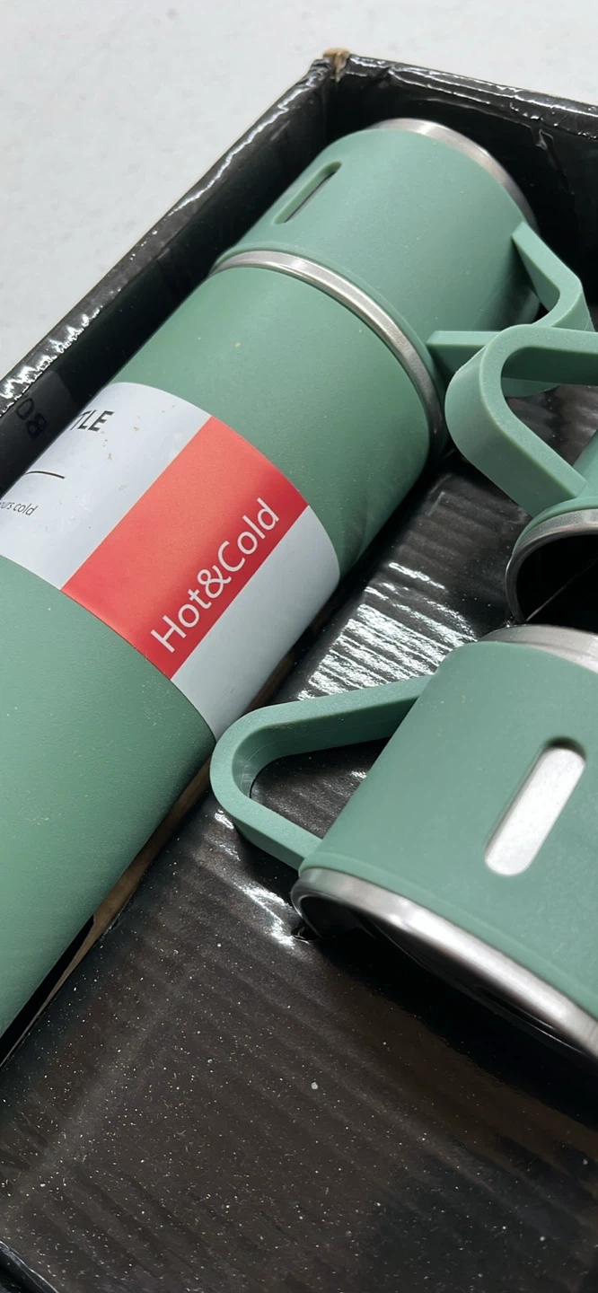 This is a green vacuum flask set with two mugs. The flask holds 500ml and keeps drinks hot or cold for 12 hours. It's made of stainless steel.