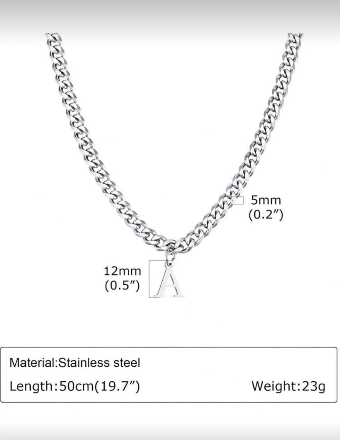 A stylish silver-tone necklace with a Cuban link chain and an initial "A" pendant. Made from stainless steel, it's 5mm thick and 50cm long. A classic accessory for everyday wear!