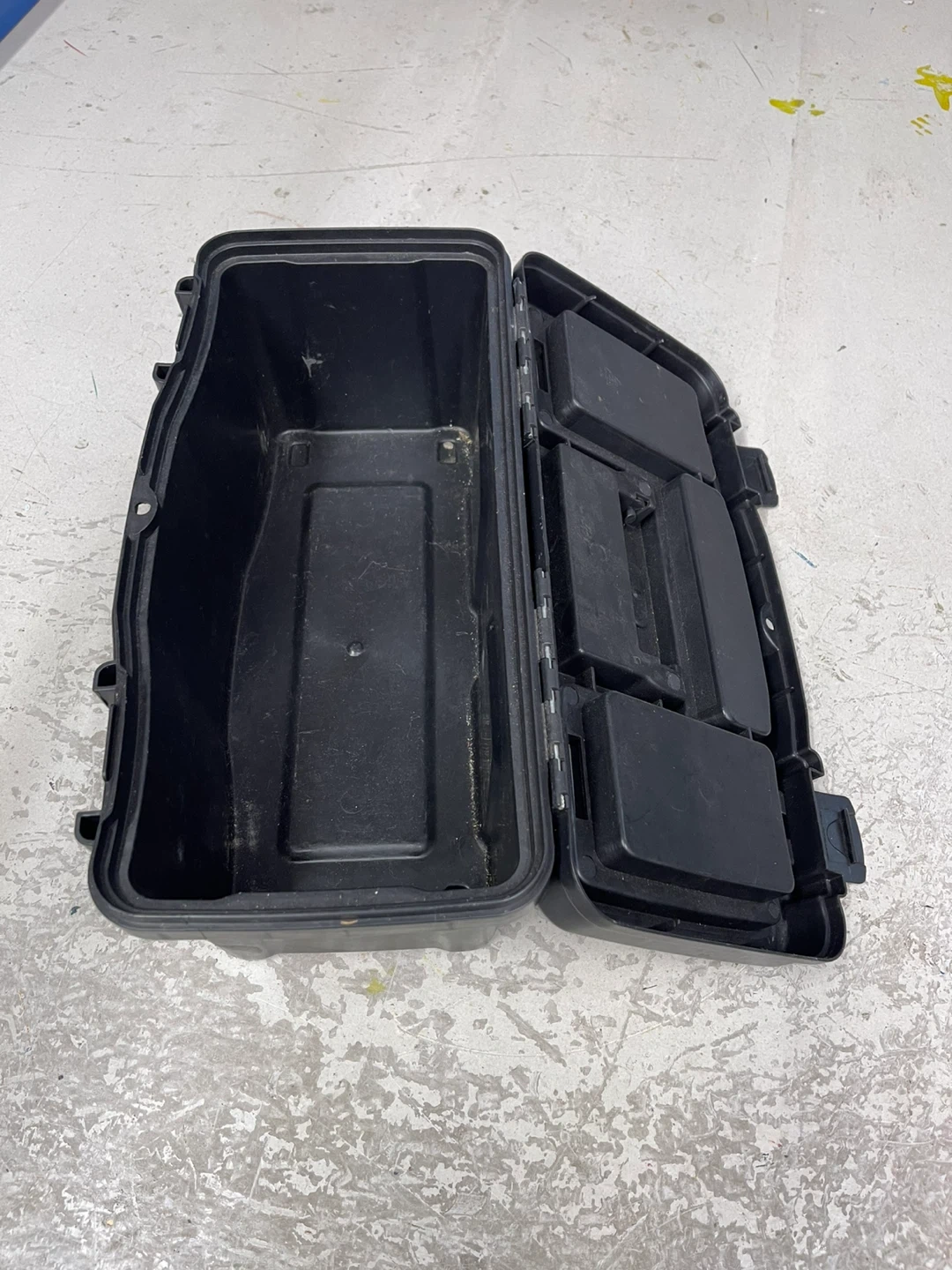 This black Stack-On 16-inch tool box is made of durable plastic. It features a removable tray for organization. This box is great for storing tools or craft supplies!