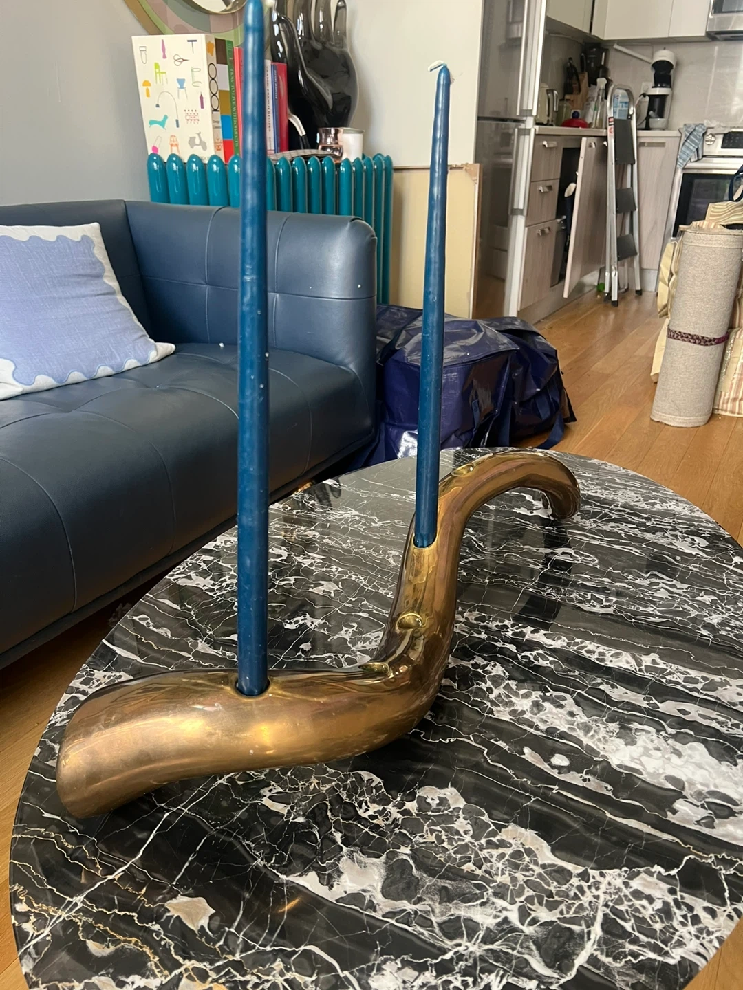 This is a striking Jonathan Adler Giant Brass Horn sculpture. It's made of polished and doubles as a cold candle holder. This statement piece adds a bold, artistic touch to any space!