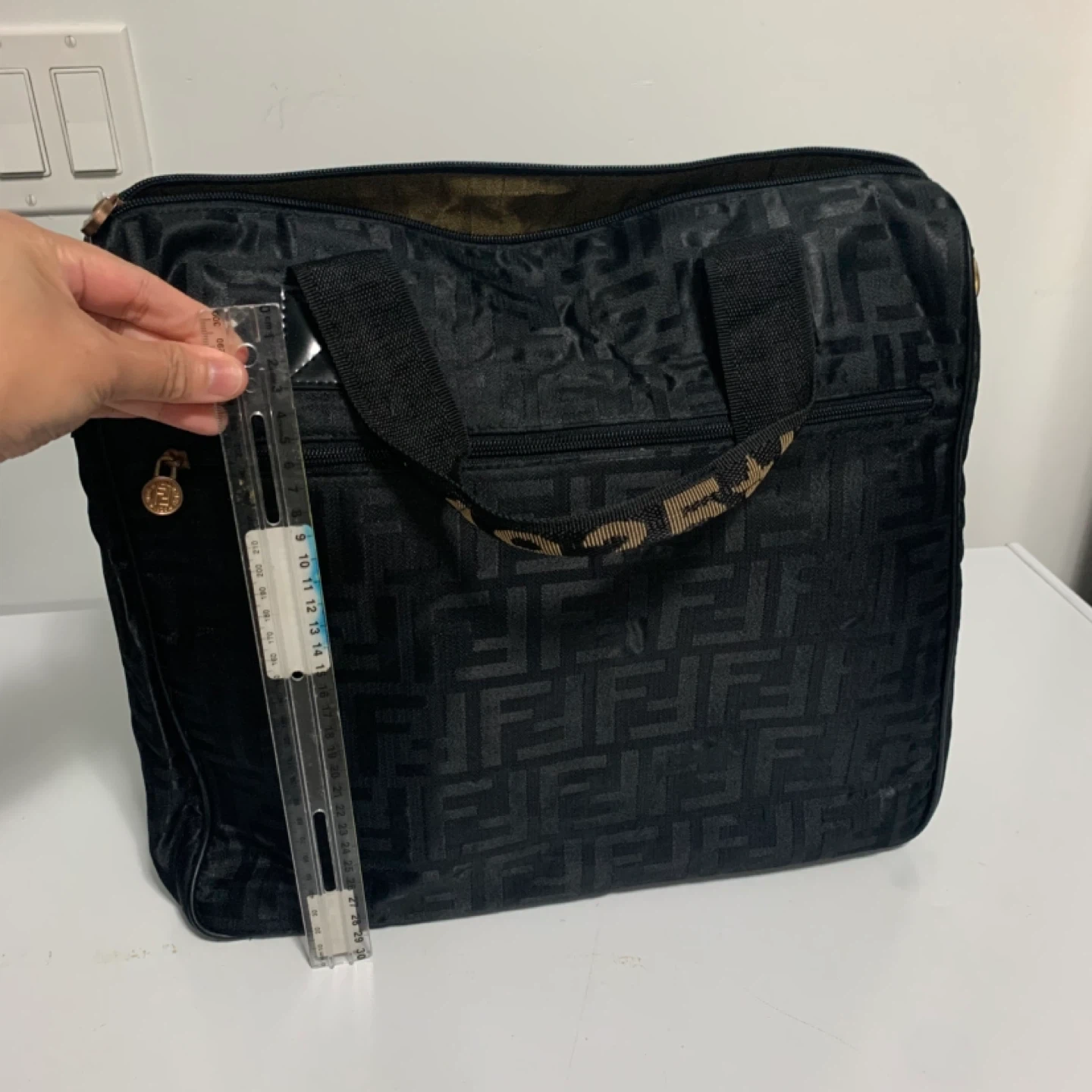 This black Fendi tote features the iconic Zucca pattern. It has two top handles and a zippered closure. An excellent choice for everyday use or travel!