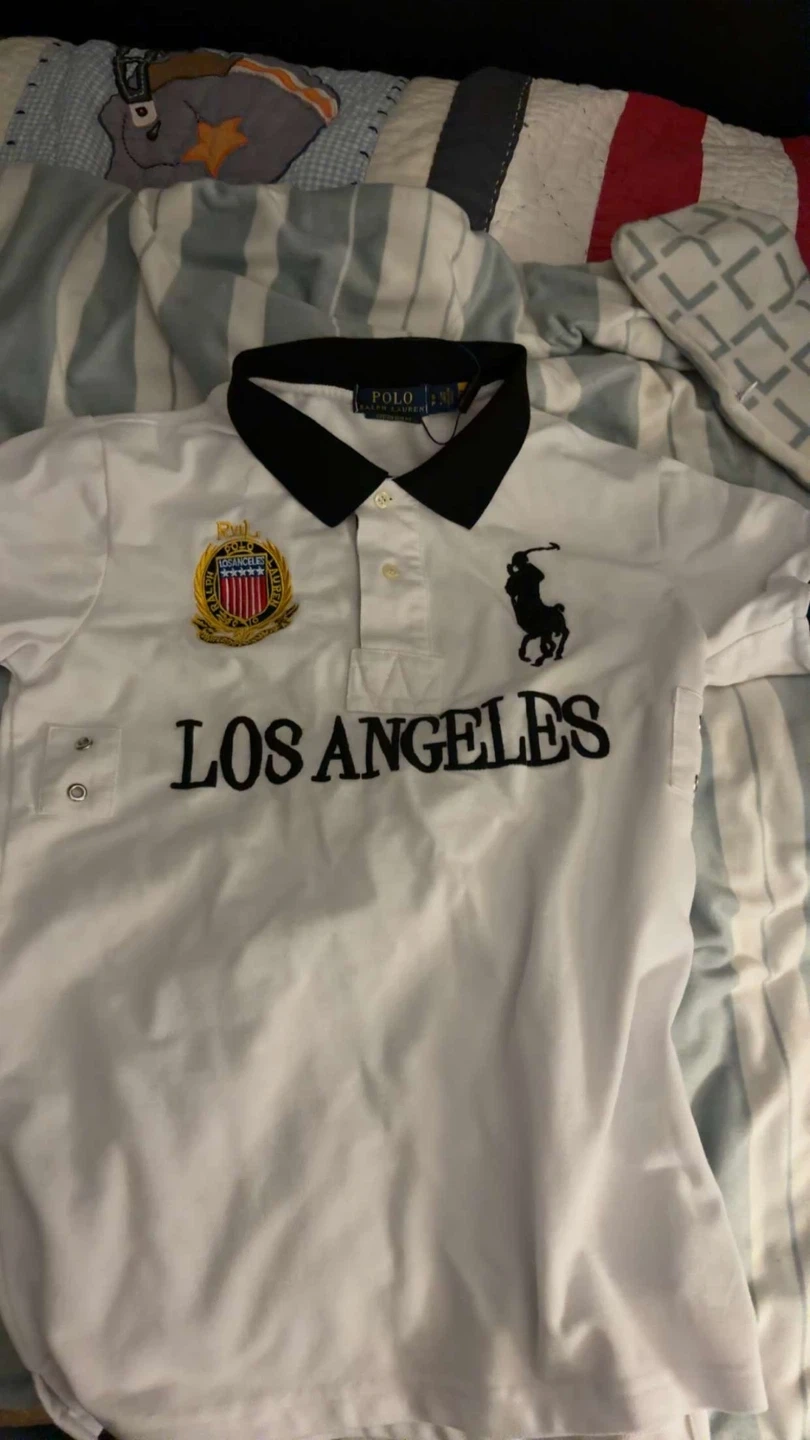 White Polo Ralph Lauren short-sleeved polo shirt with a black collar. It features 'LOS ANGELES' across the chest and a large '3' on the back. It's a stylish piece for any fan!