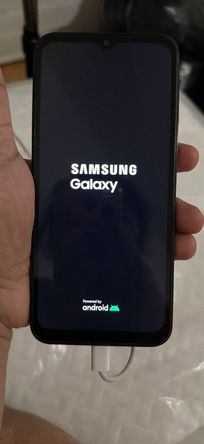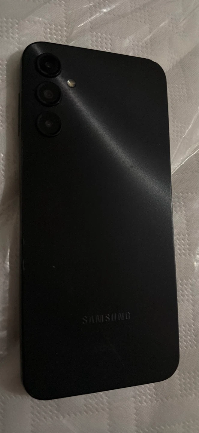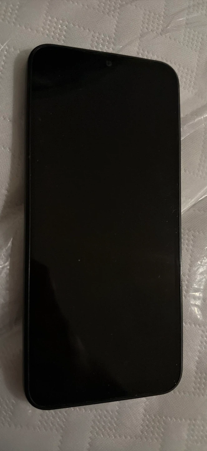 This is a black Samsung Galaxy 128gb smartphone. It's running on the Android operating system. It features a triple-camera setup on the back. The screen is a notch-style display.