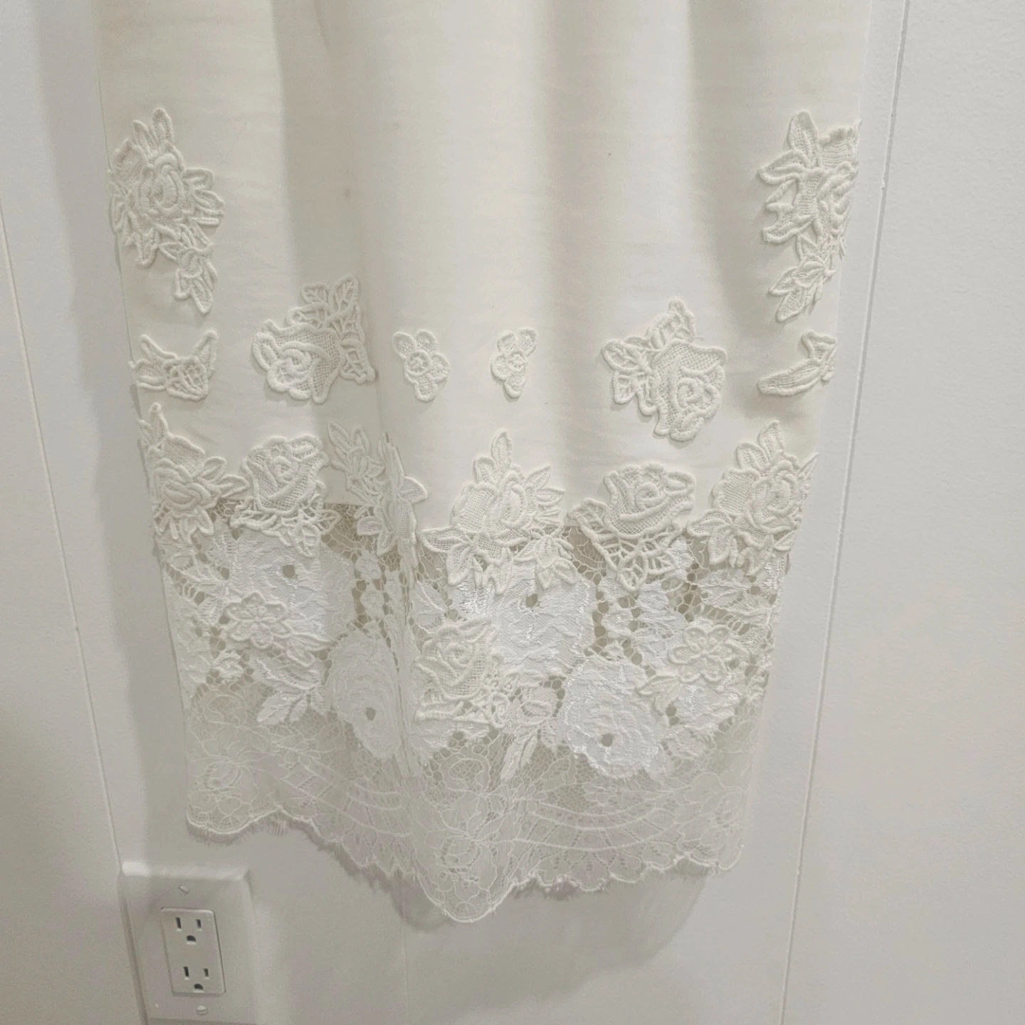 Features a lace bodice with floral applique and matching lace scalloped hem. Modern romantic, bodycon silhouette is crafted from a premium cotton-blend fabric that provides both comfort and a tailored fit with stretch for movement.