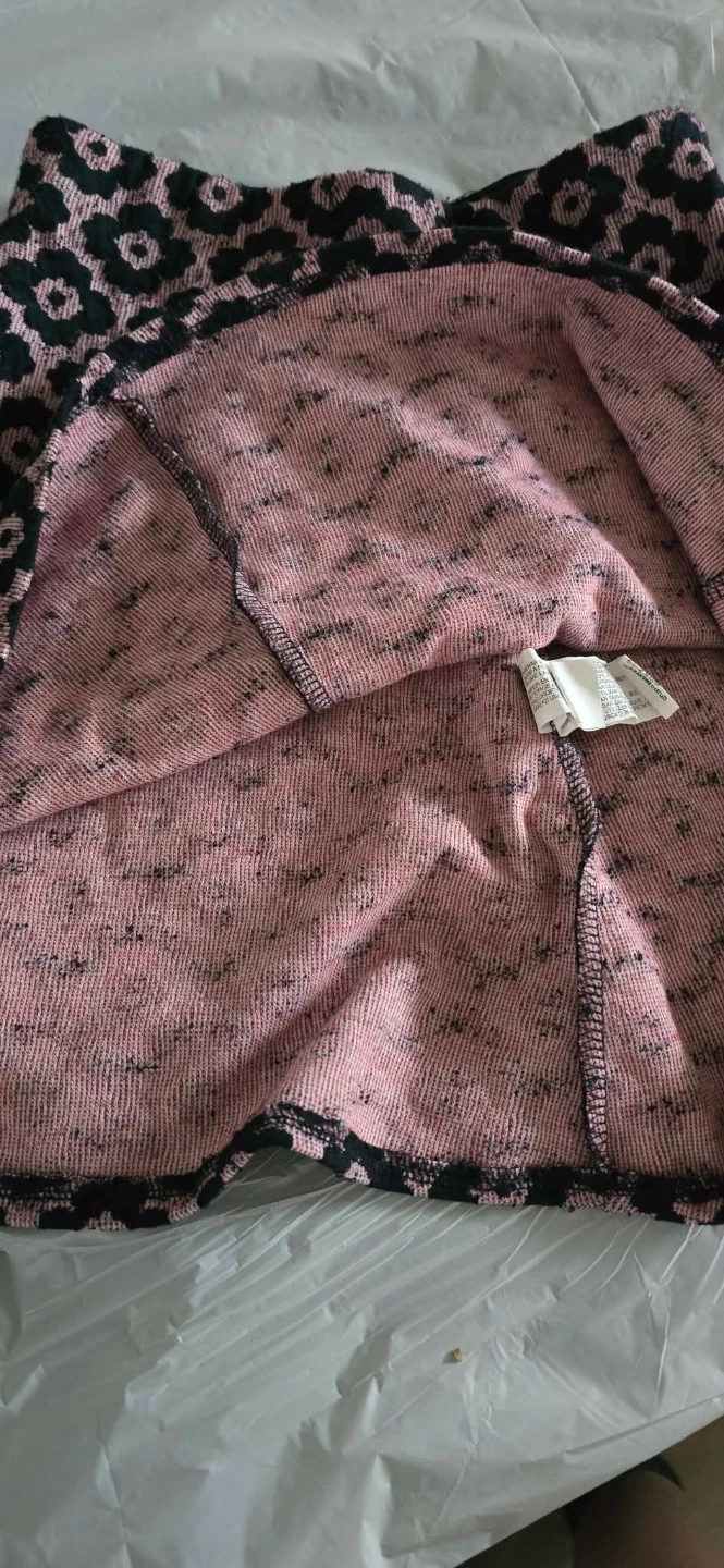 Cute pink and black A-line skirt with a floral pattern. It's made of a soft, textured knit fabric. A fun addition to your wardrobe!